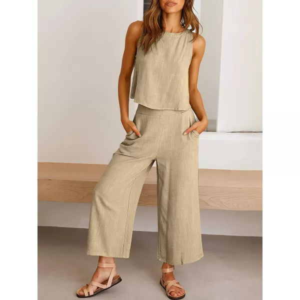 imageANRABESS Womens Summer 2 Piece Outfits Sleeveless Tank Crop Button Back Top Cropped Wide Leg Pants Set PocketsApricot