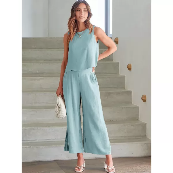 ANRABESS Women's Summer 2 Piece Outfits Sleeveless Tank Crop Button Back Top Cropped Wide Leg Pants Set Pockets(Blue)
