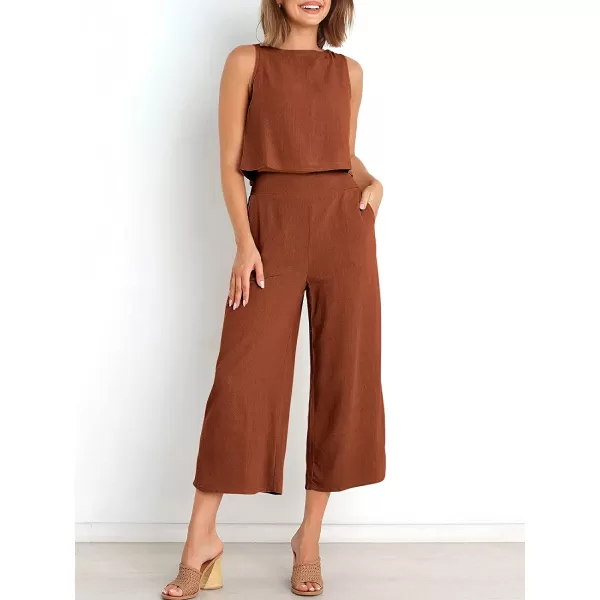 ANRABESS Women's Summer 2 Piece Outfits Sleeveless Tank Crop Button Back Top Cropped Wide Leg Pants Set Pockets(Brick Red)