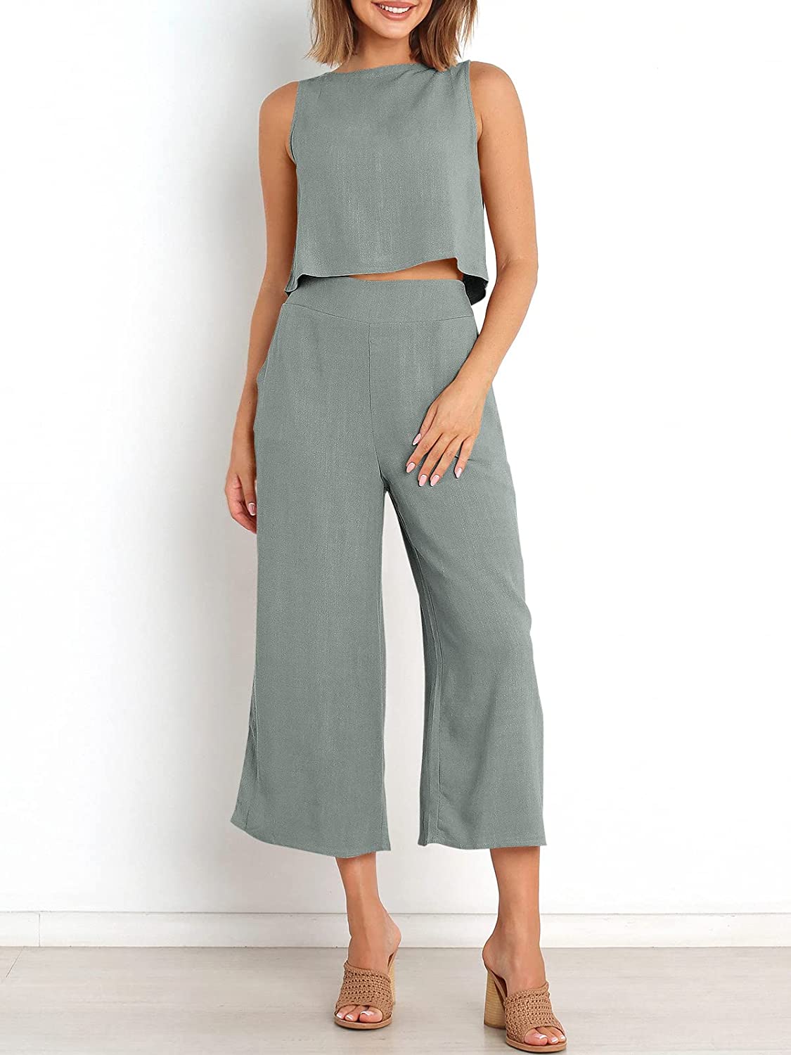 Features – This 2 piece outfit features a sleeveless round neck crop top, wide-leg cropped pants, button back, high waist, and a wide waistband for added comfort.
