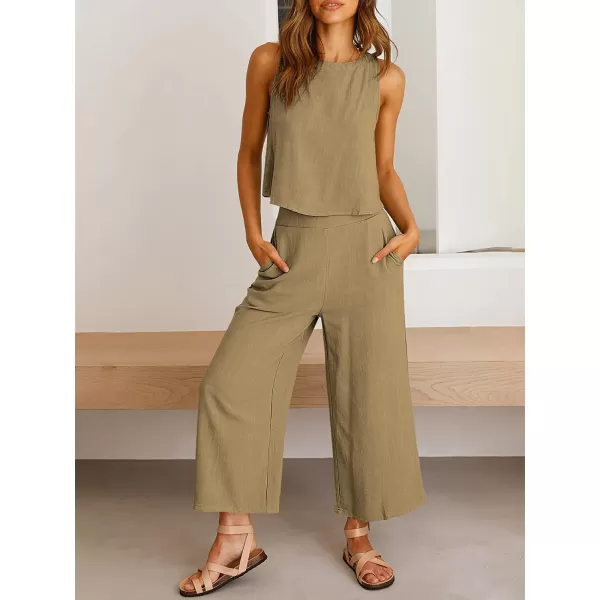 ANRABESS Women’s Summer 2 Piece Outfits Sleeveless Tank Crop Button Back Top Cropped Wide Leg Pants Set Pockets(Khaki)