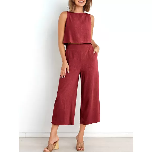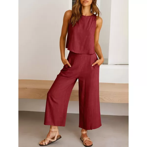 imageANRABESS Womens Summer 2 Piece Outfits Sleeveless Tank Crop Button Back Top Cropped Wide Leg Pants Set PocketsWine Red