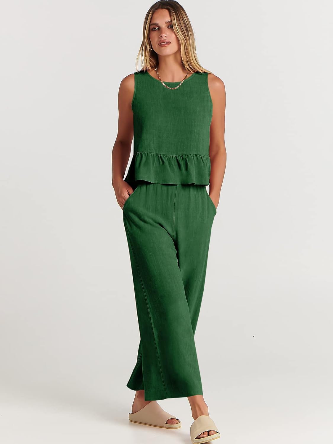 ANRABESS Women’s Summer 2 Piece Outfits Sleeveless Tank Crop Top Wide Leg Pants Linen Lounge Matching Sets(Grass)