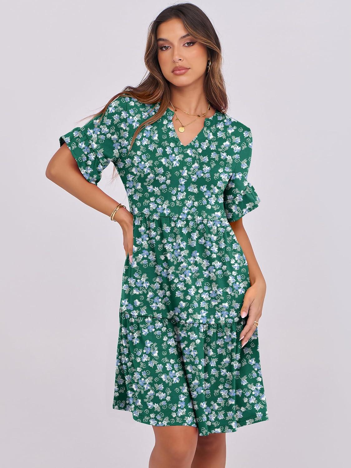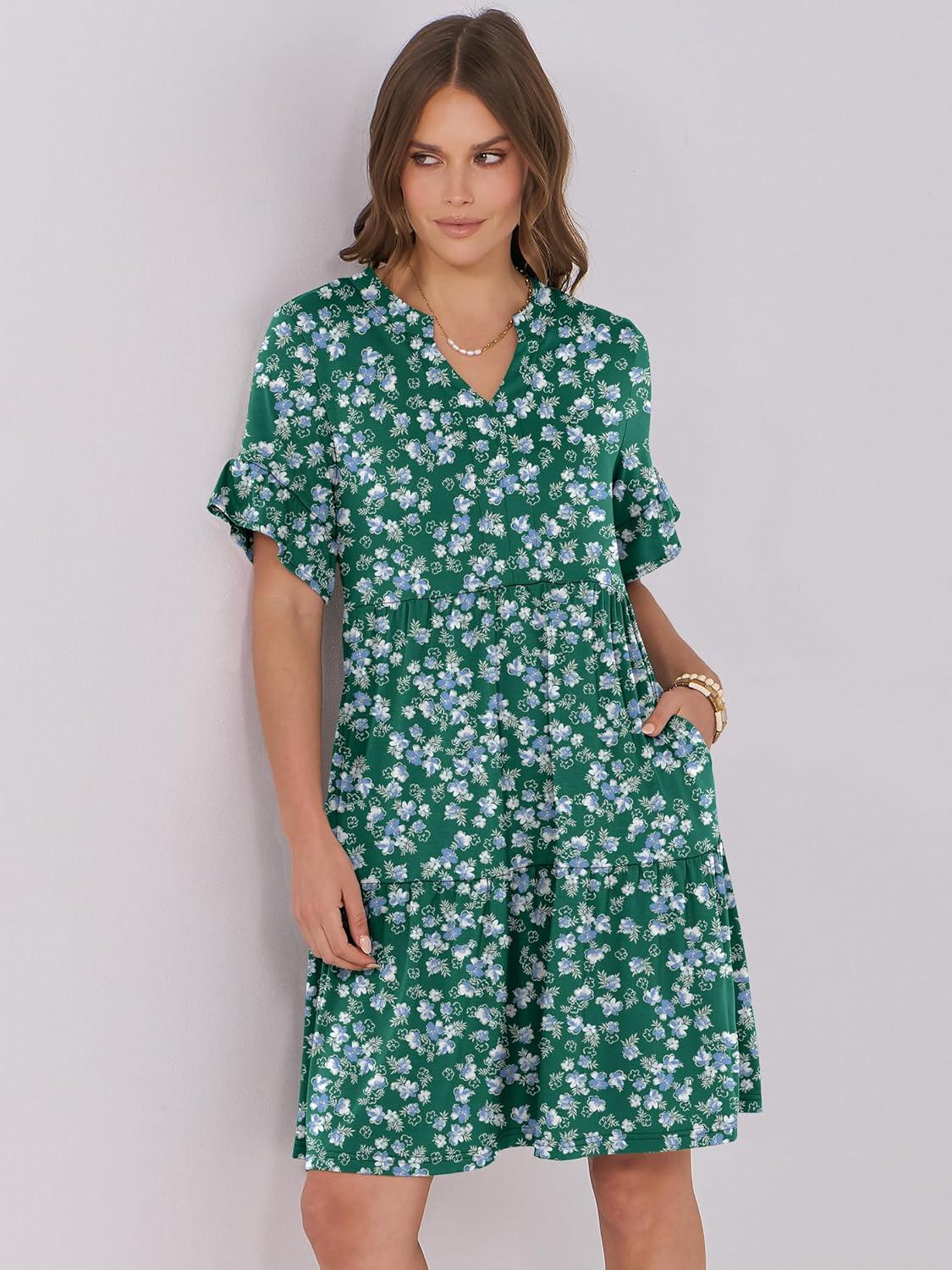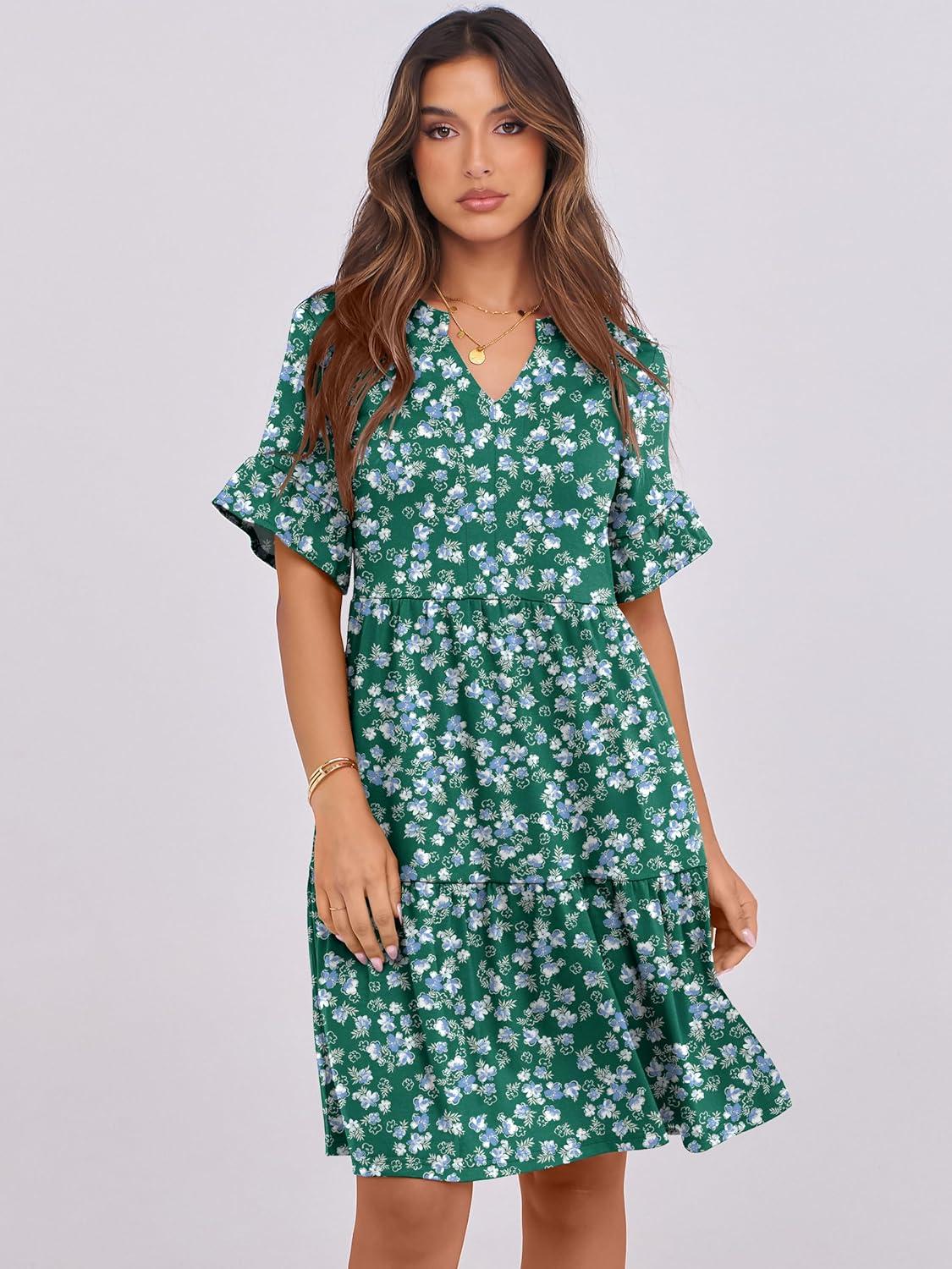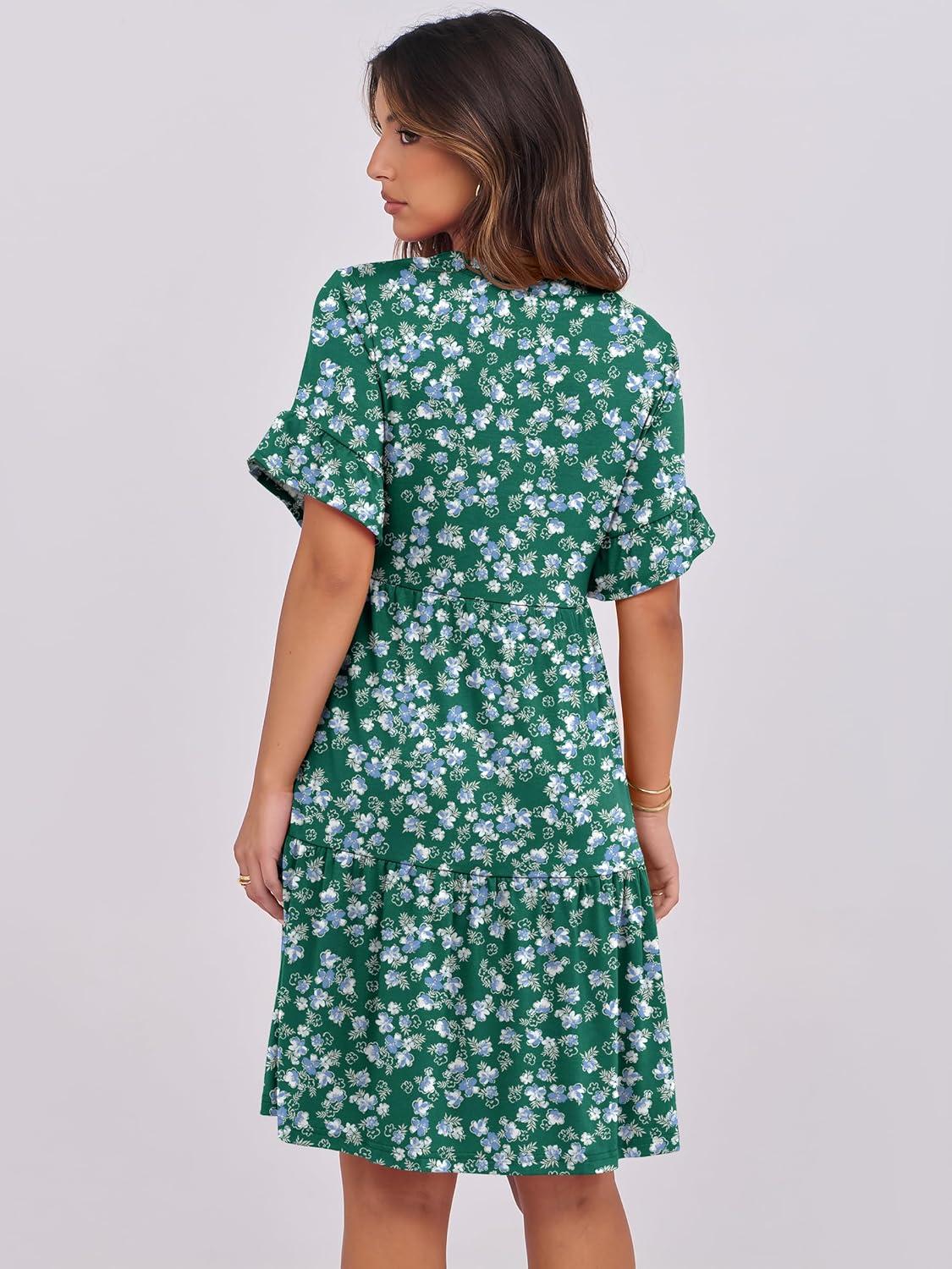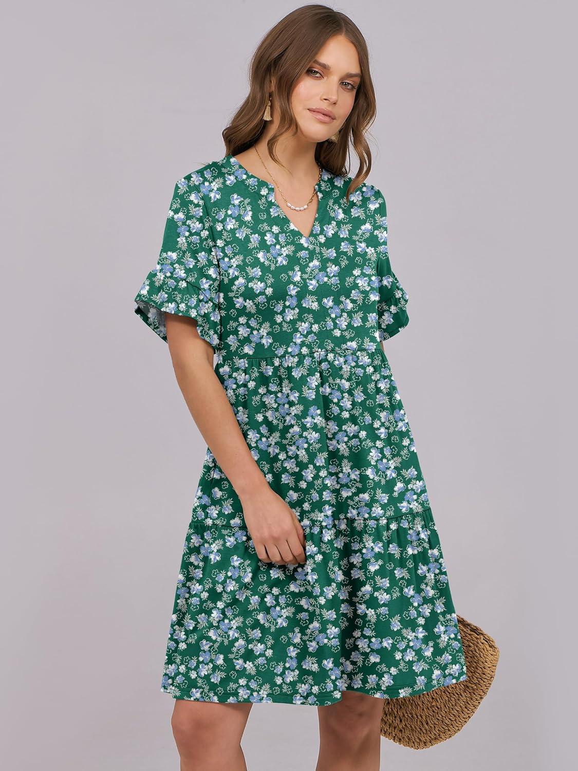 ANRABESS Womens Summer 2025 Trendy Ruffle Short Sleeve V Neck A Line Tiered Flowy Loose Casual Mini Beach Dress with Pockets(Green Blue Floral)