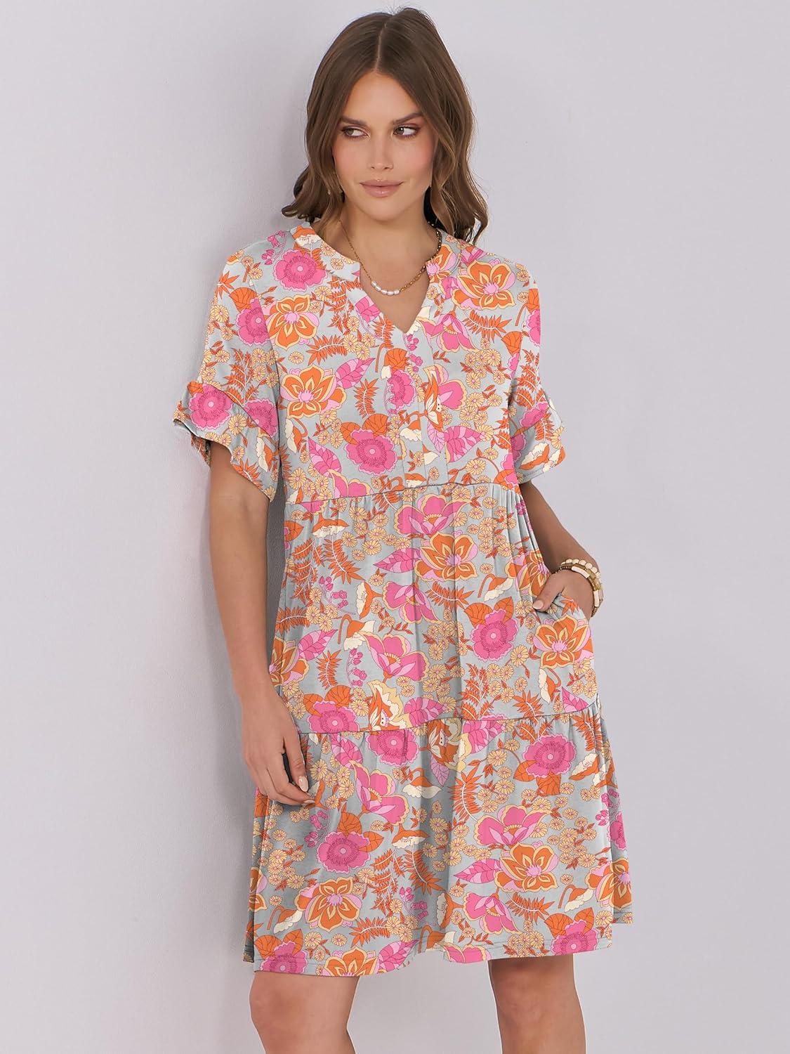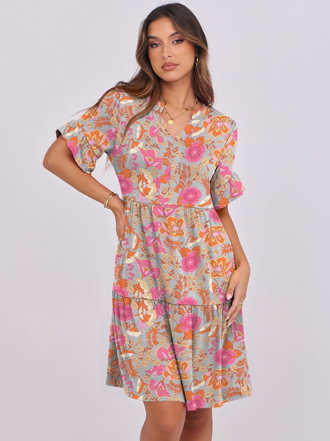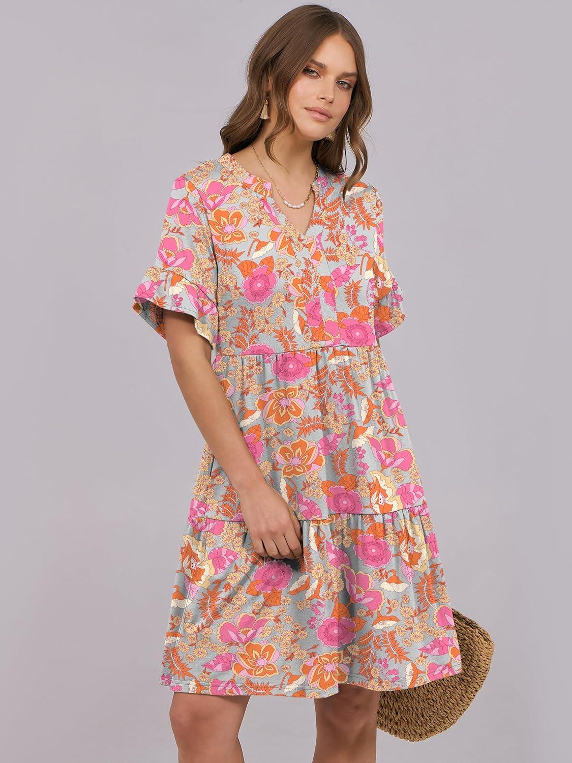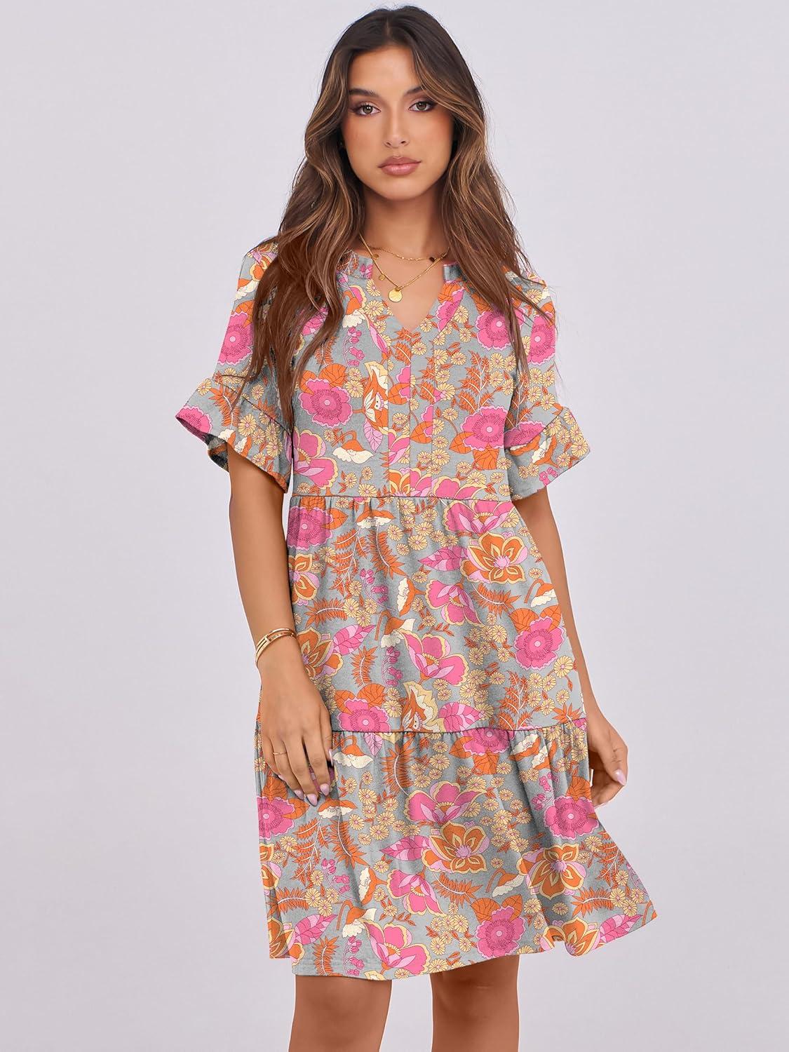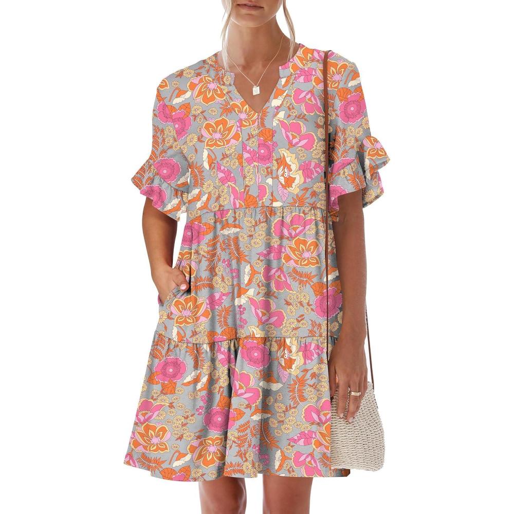 ANRABESS Womens Summer 2025 Trendy Ruffle Short Sleeve V Neck A Line Tiered Flowy Loose Casual Mini Beach Dress with Pockets(Grey Pink Floral)