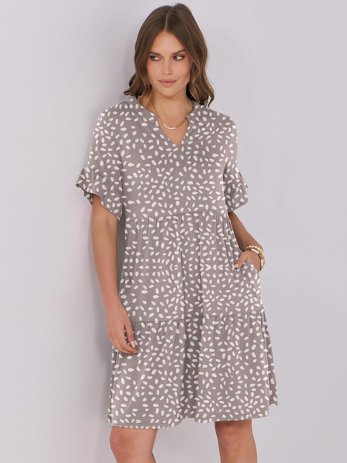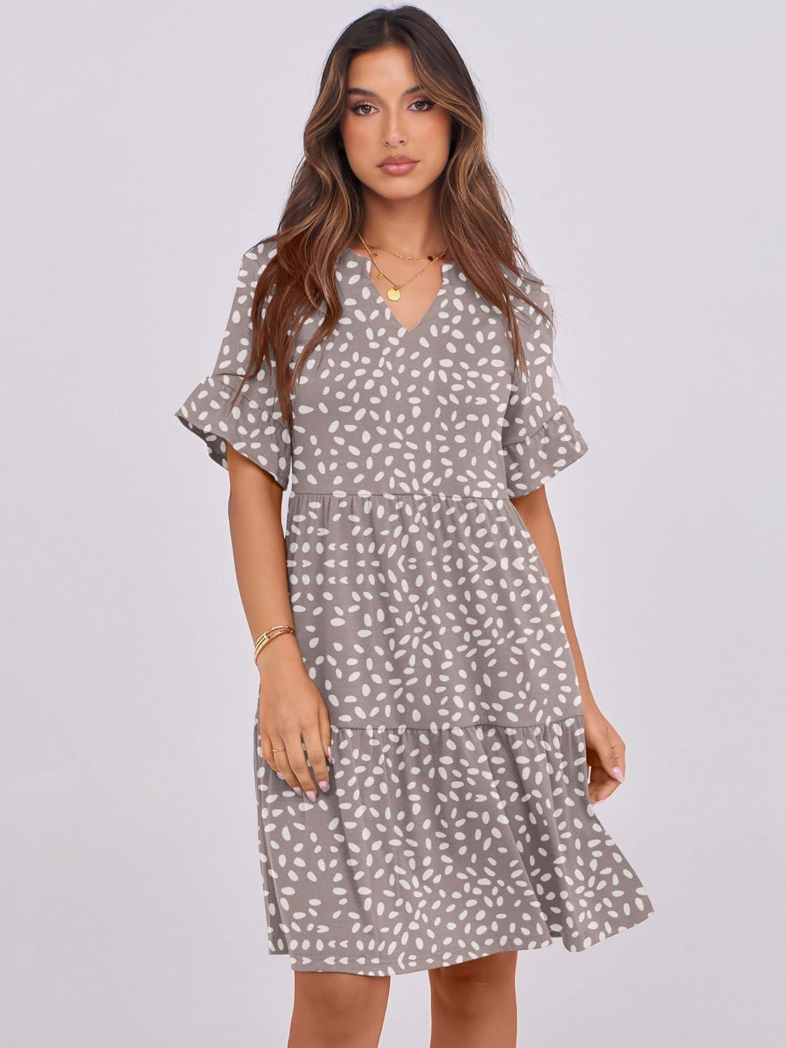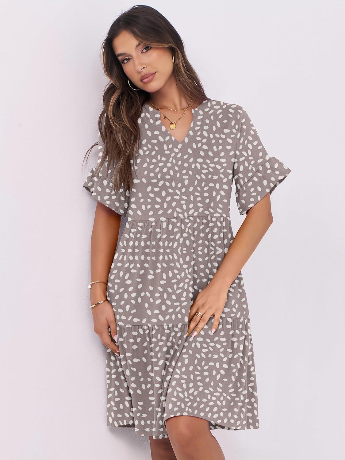 ANRABESS Womens Summer 2025 Trendy Ruffle Short Sleeve V Neck A Line Tiered Flowy Loose Casual Mini Beach Dress with Pockets(Khaki Polka Dot)