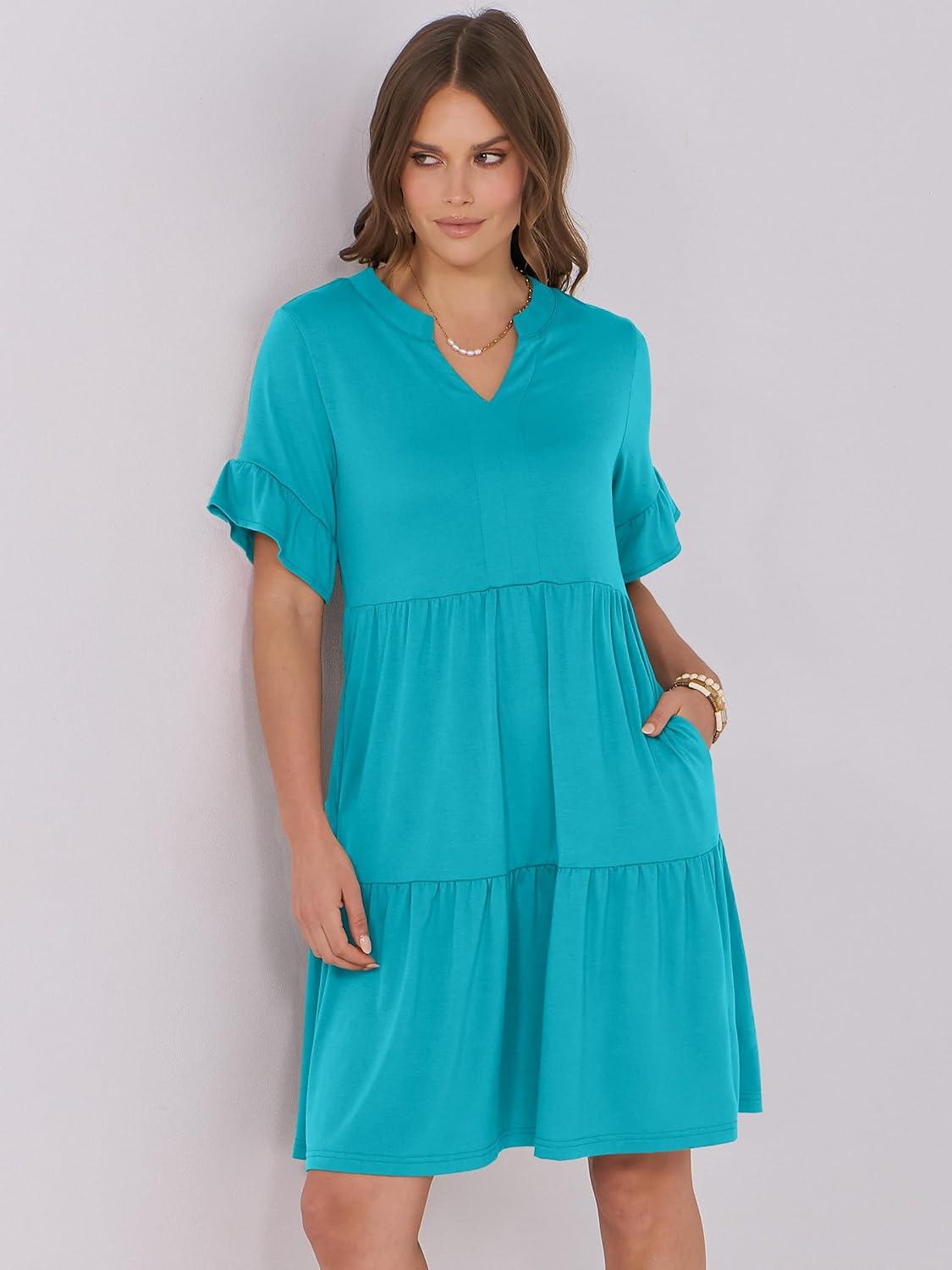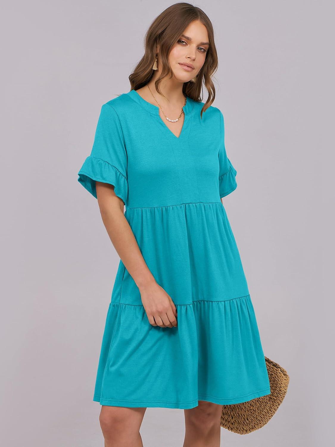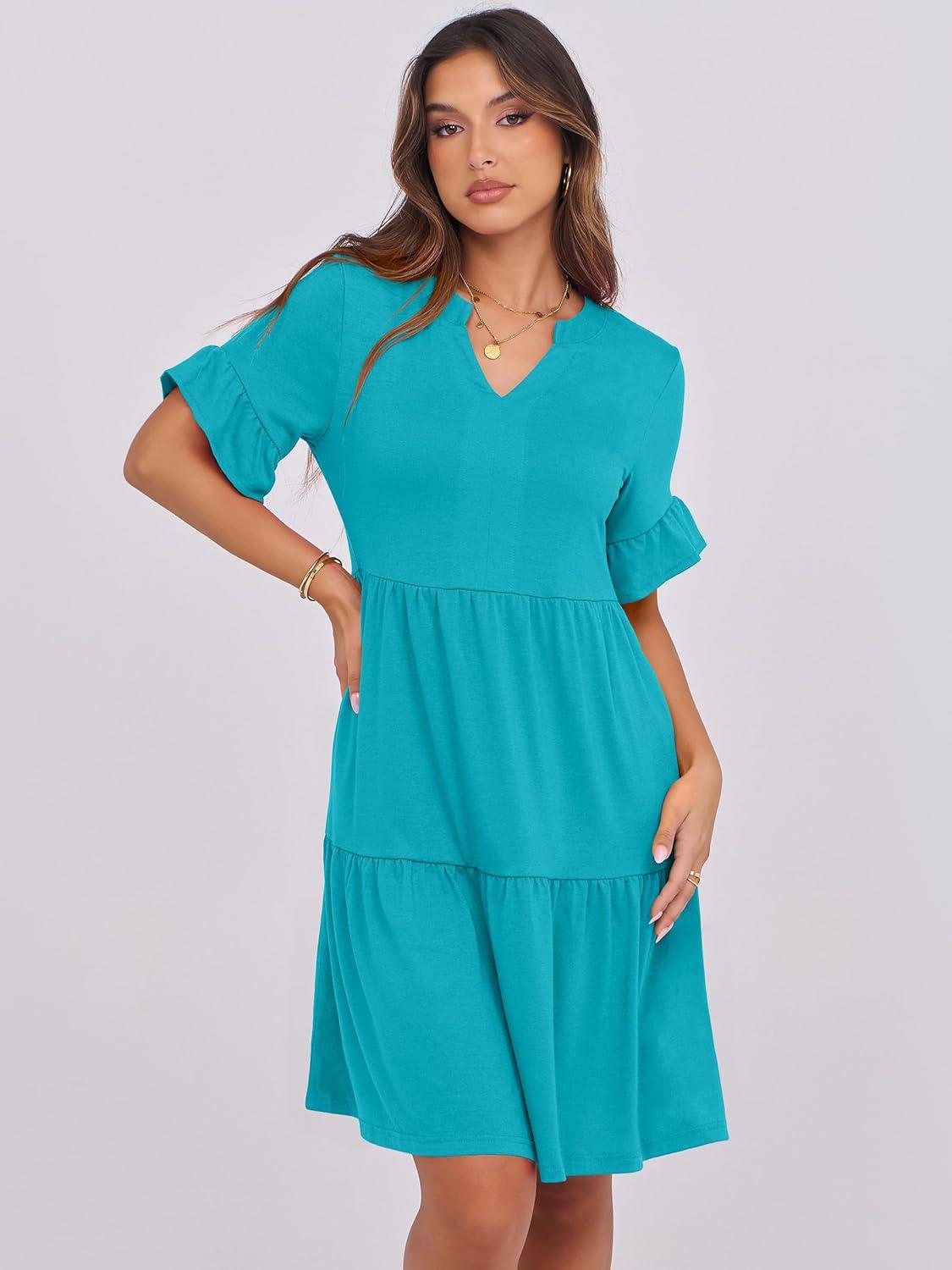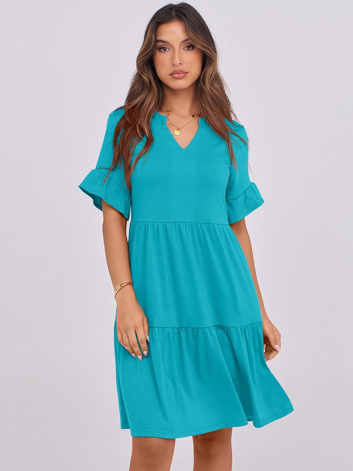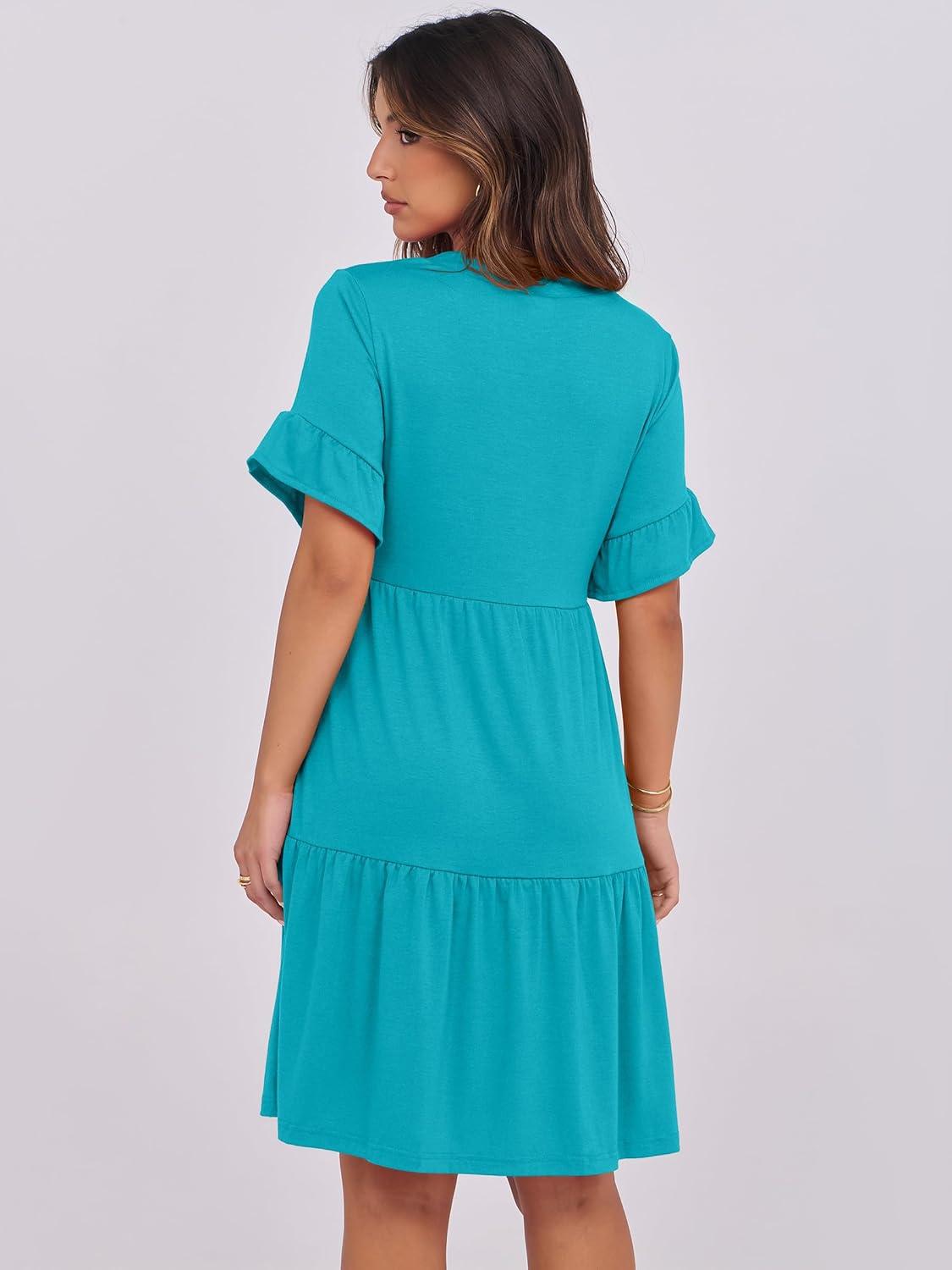 ANRABESS Womens Summer 2025 Trendy Ruffle Short Sleeve V Neck A Line Tiered Flowy Loose Casual Mini Beach Dress with Pockets(Lake Green)