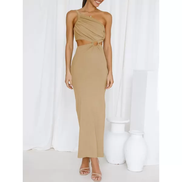 ANRABESS Women’s Summer Bodycon Maxi Dress One Shoulder Sleeveless Sexy Cut Out Formal Party Dress(Khaki)