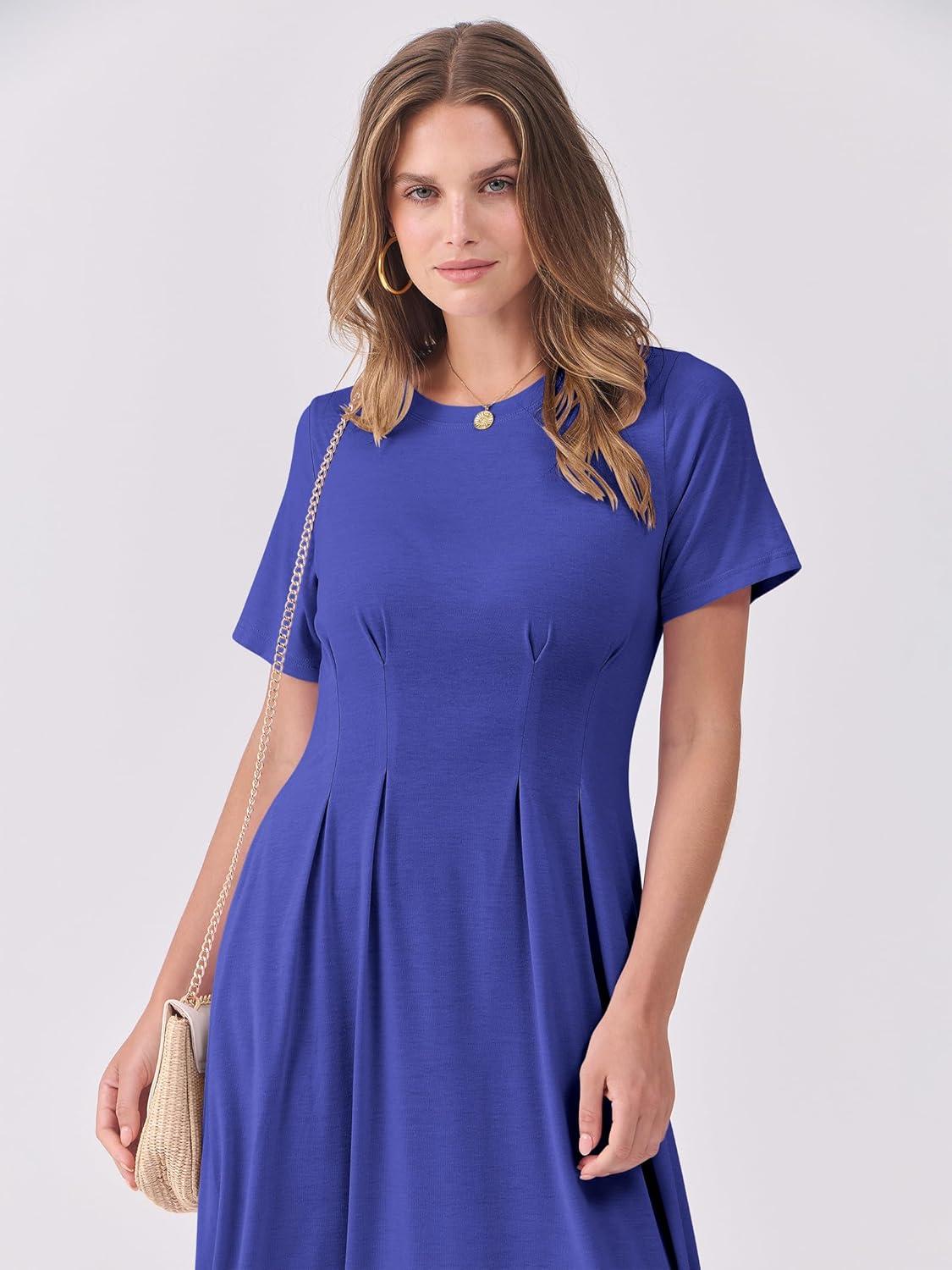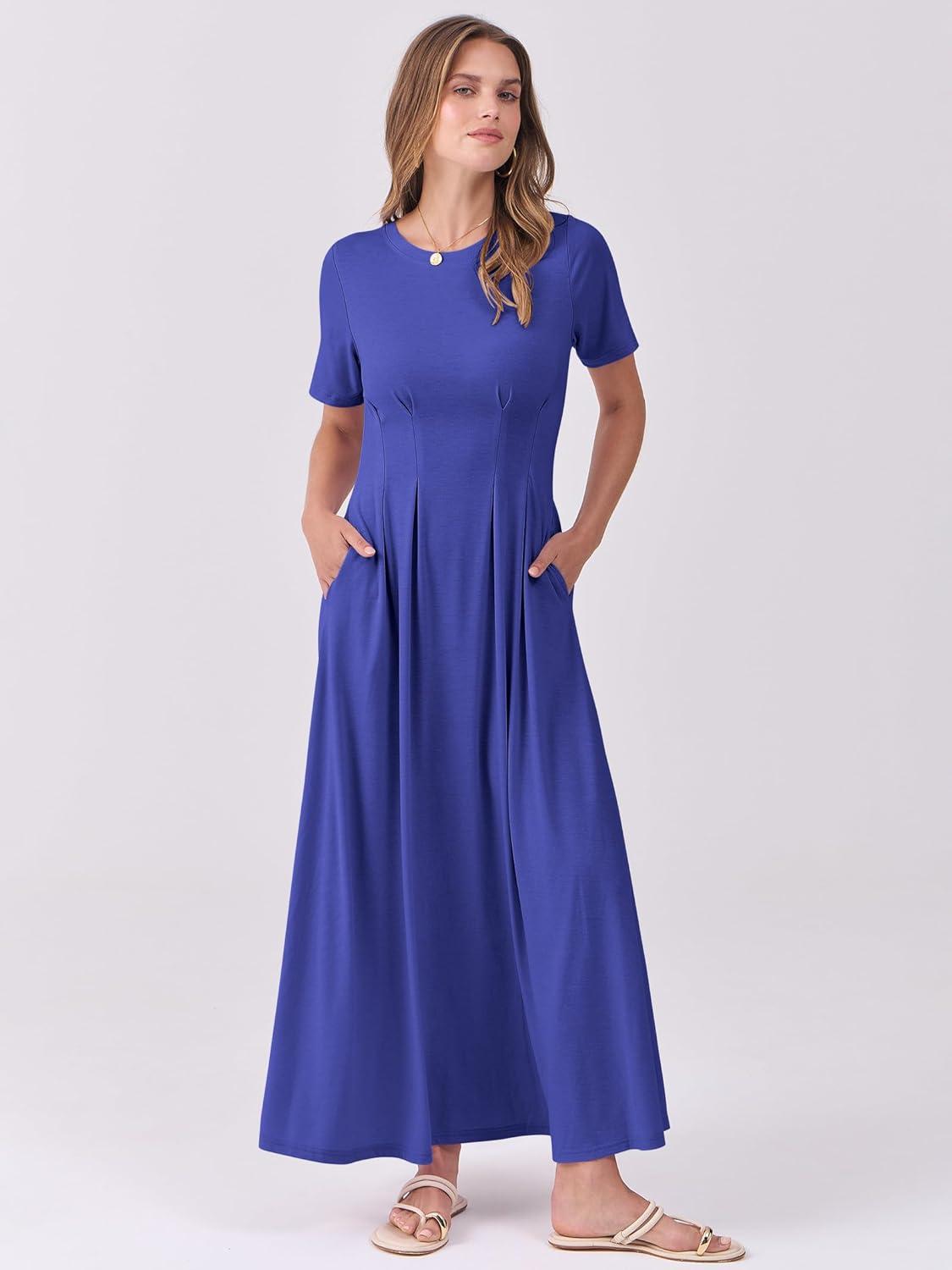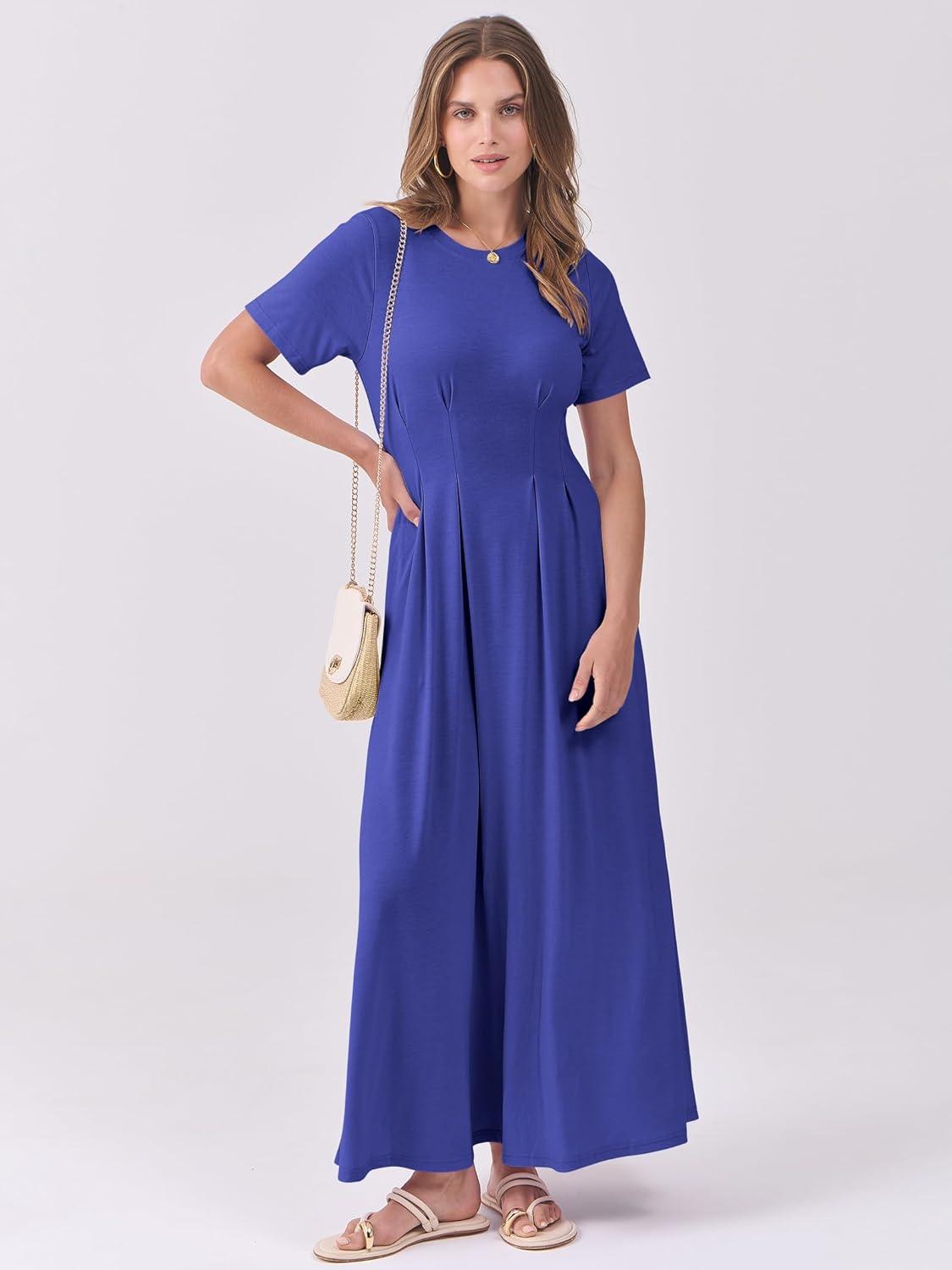 ANRABESS Women's Summer Casual Dress Short Sleeve Crewneck Pleated Waisted Swing Flowy 2025 A Line Beach Maxi Long Dresses(Royal Blue)