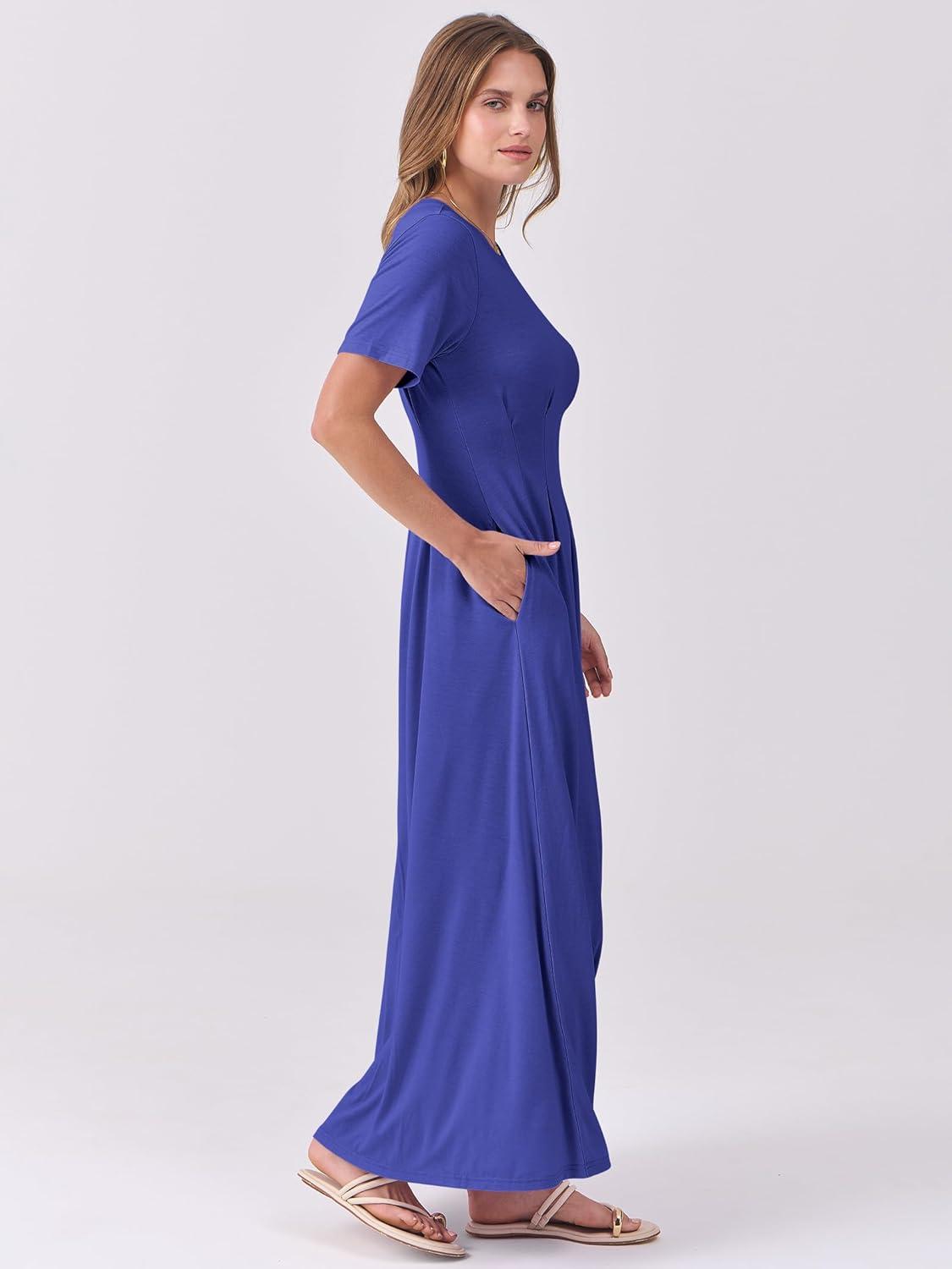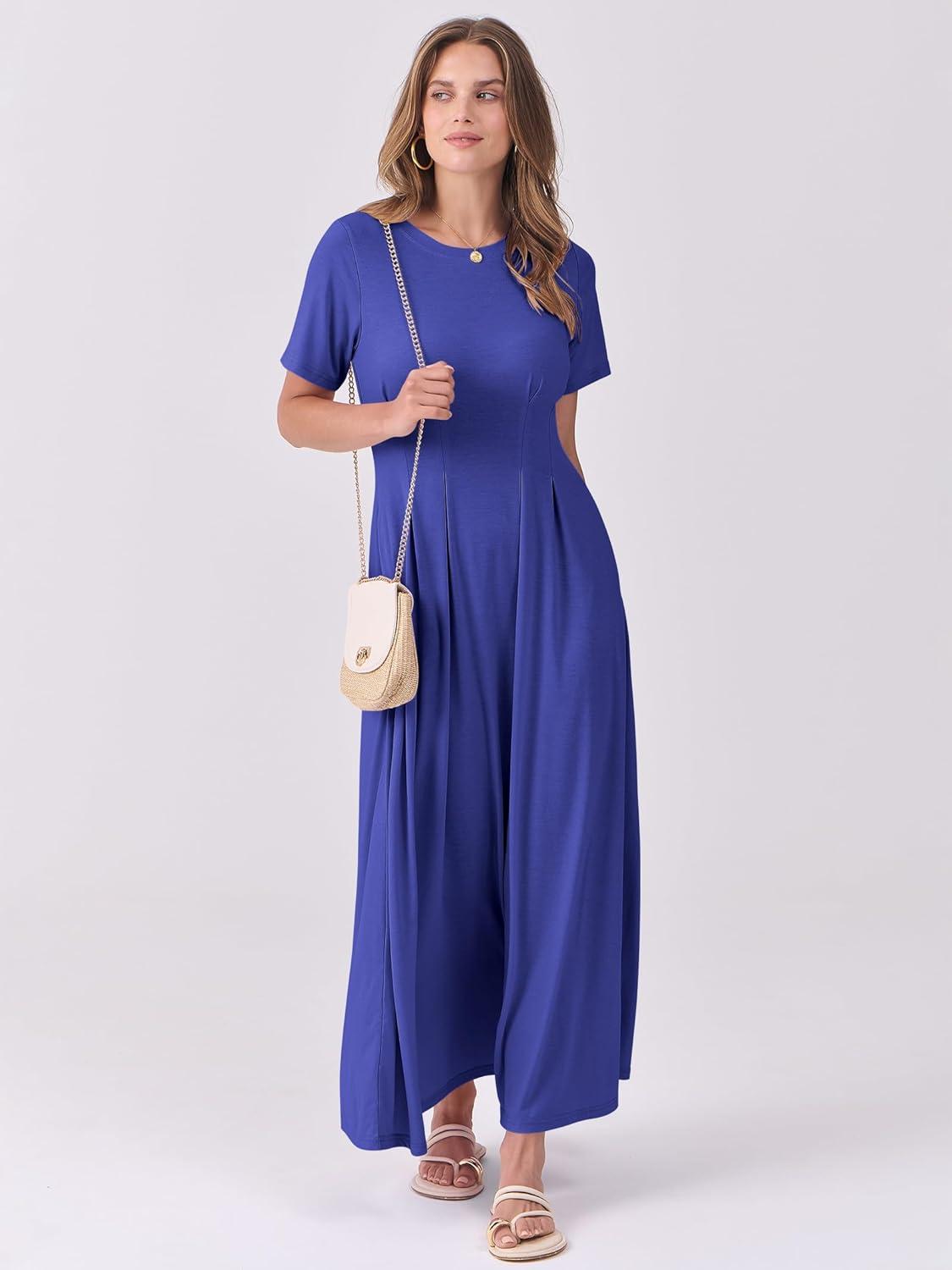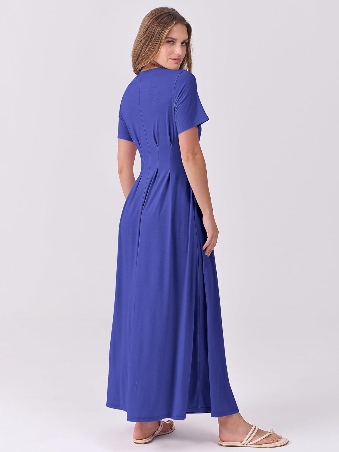 ANRABESS Women's Summer Casual Dress Short Sleeve Crewneck Pleated Waisted Swing Flowy 2025 A Line Beach Maxi Long Dresses(Royal Blue)