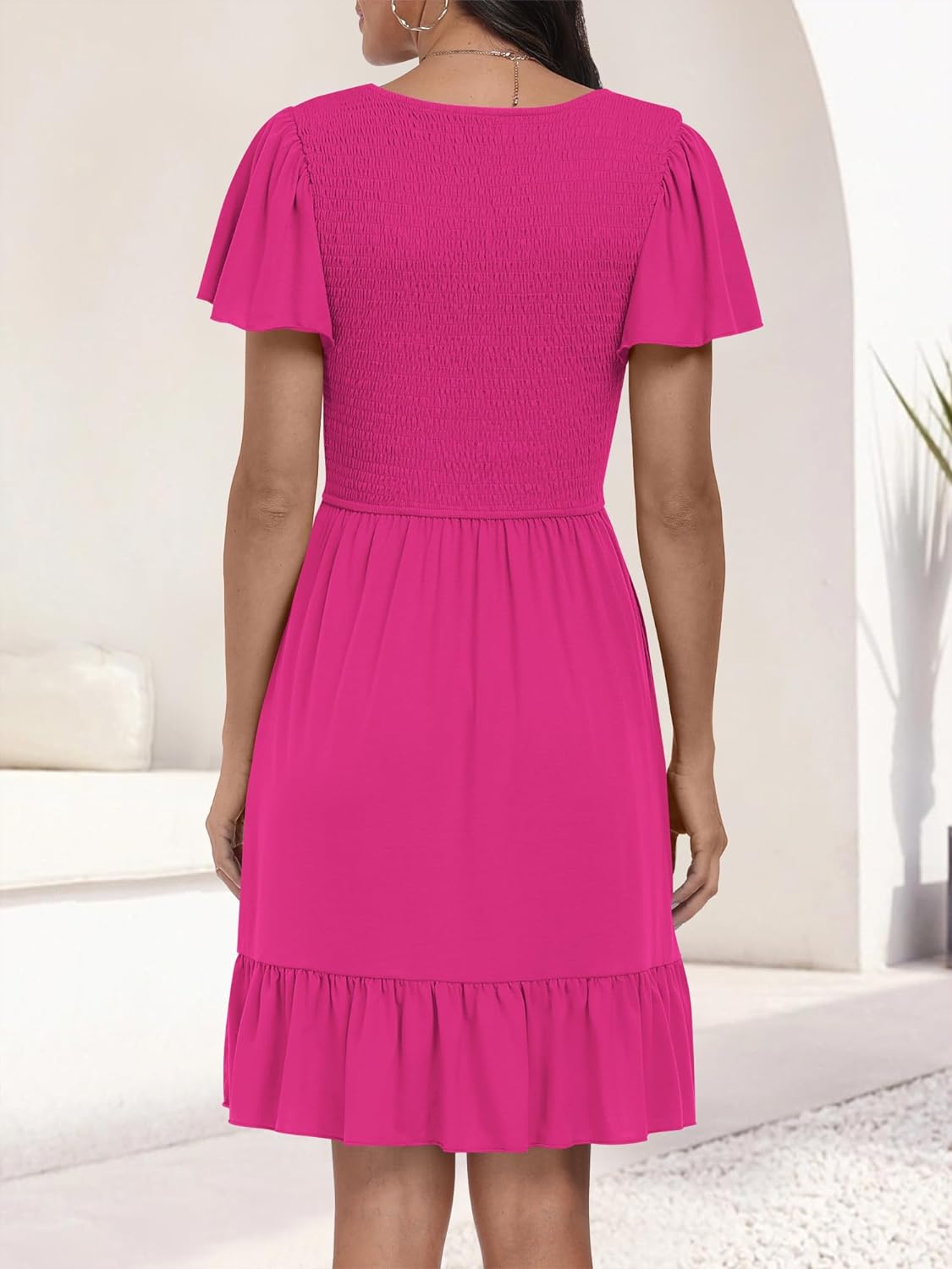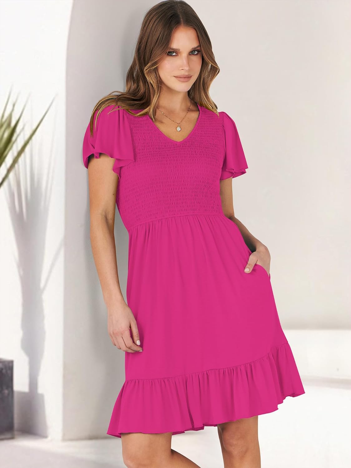 ANRABESS Women's Summer Casual Flowy Smocked V Neck Flutter Sleeve Beach Mini Dress with Pockets(Hot Pink)