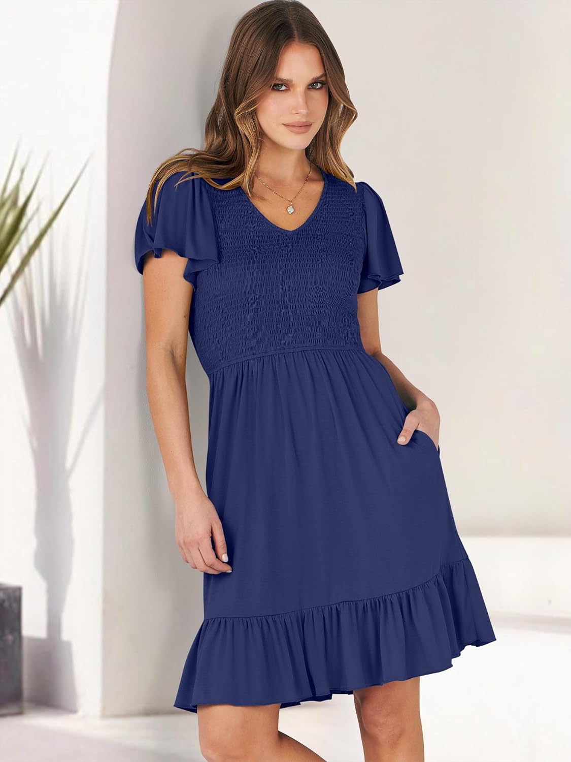ANRABESS Women’s Summer Casual Flowy Smocked V Neck Flutter Sleeve Beach Mini Dress with Pockets(Navy Blue)