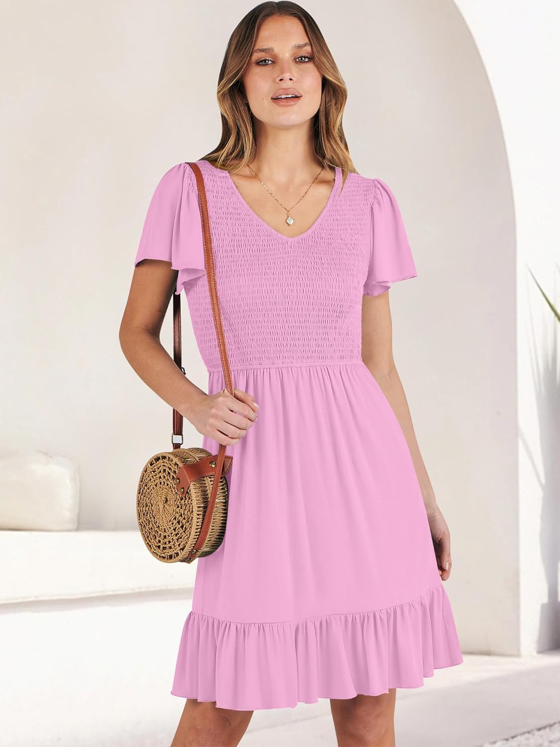 imageANRABESS Womens Summer Casual Flowy Smocked V Neck Flutter Sleeve Beach Mini Dress with PocketsPink