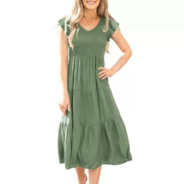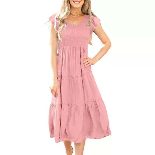 Features – This bold and breezy midi dress has a flattering elastic shirred top, features a v neck, solid color, high waist, short cap sleeves, edged with playful frills at shoulder, back key-hole closure and a flowy tiered midi skirt, adds more feminine.