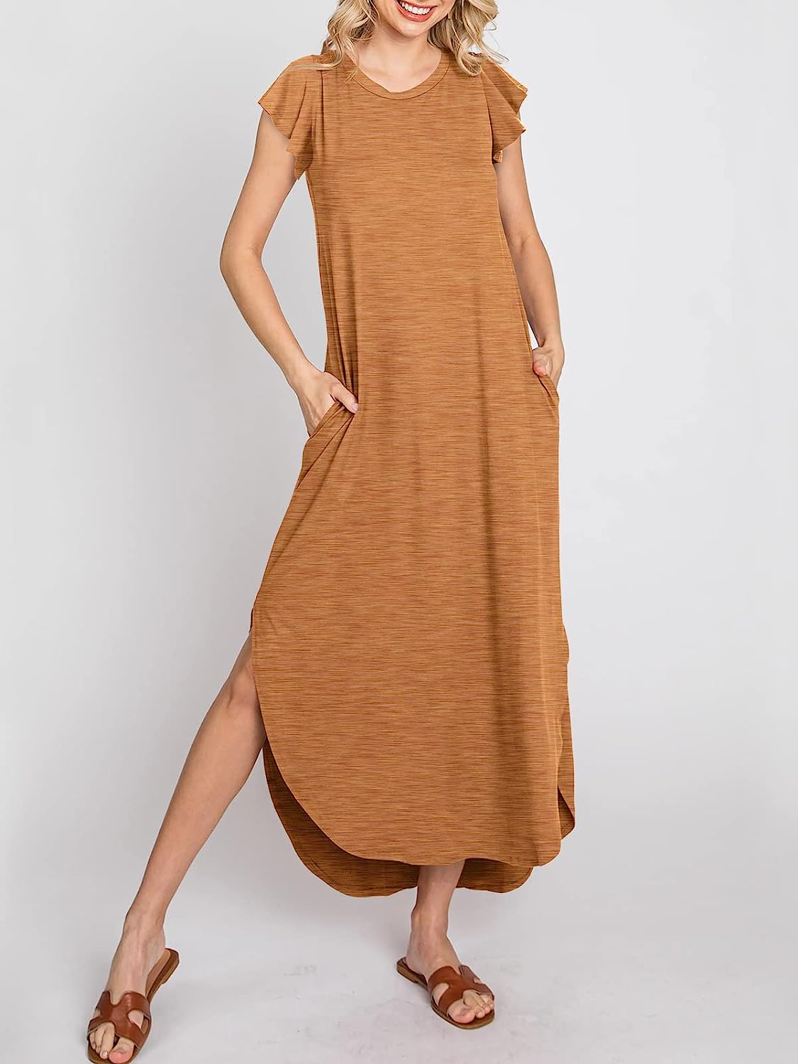 Features – Cute flutter sleeves,crewneck,maxi length,slit side,pockets.curve hem,beach dress.