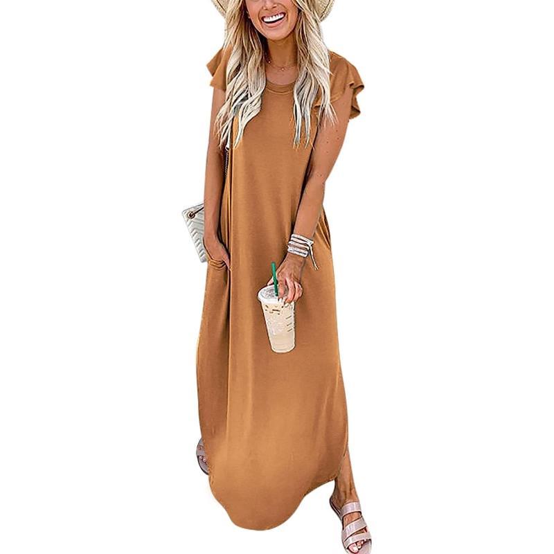 ANRABESS Women’s Summer Casual Loose Crewneck Ruffle Short Sleeves Split Beach Maxi Long Dress with Pockets(Brown)