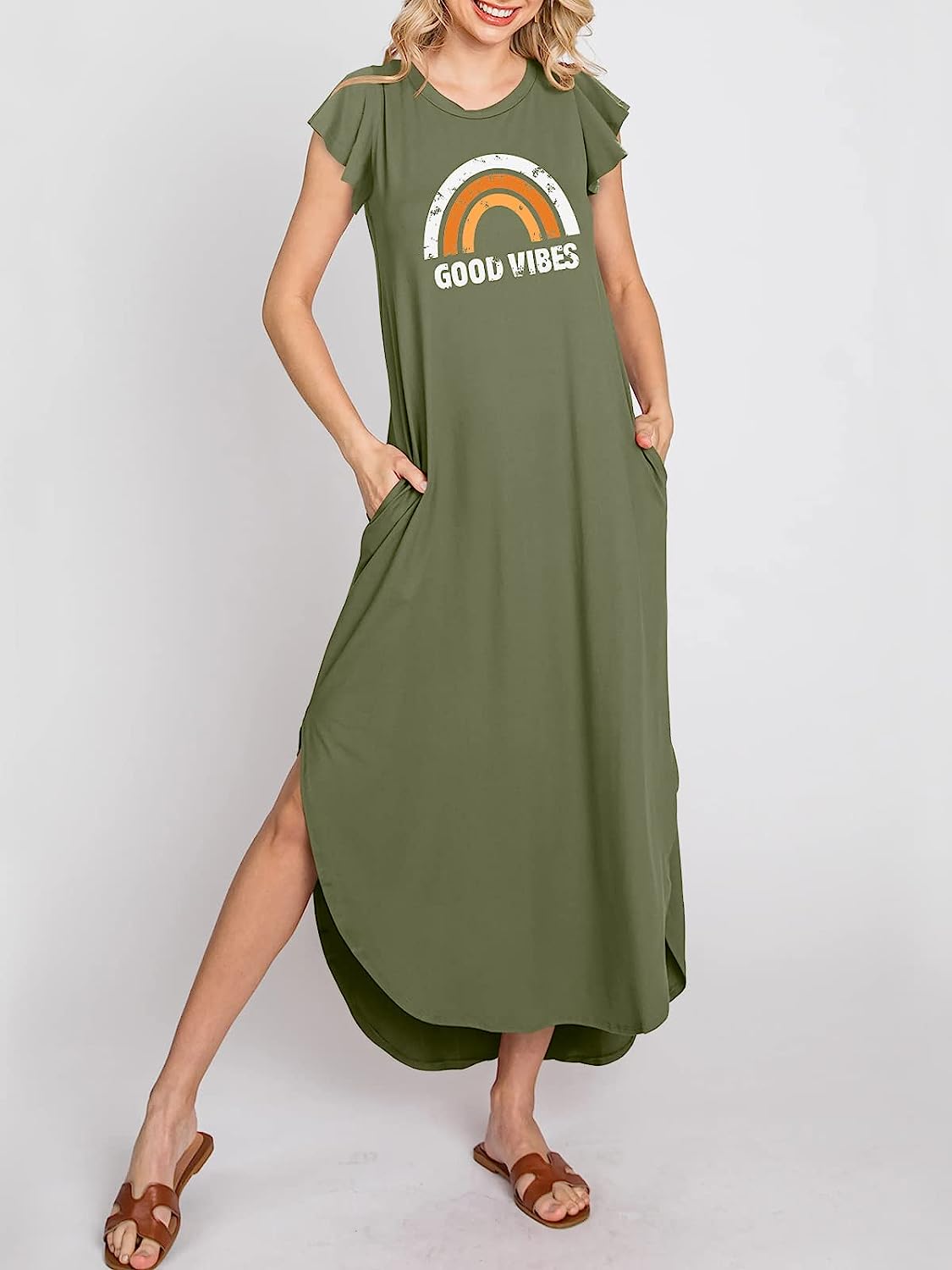 Features – Cute flutter sleeves,crewneck,maxi length,slit side,pockets.curve hem,beach dress.