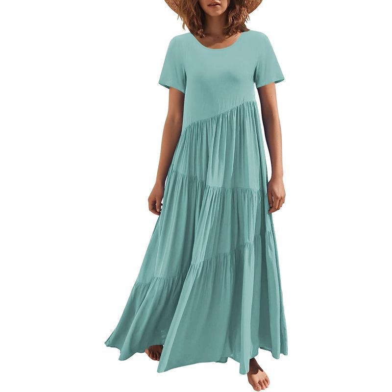 Features – Full length,short sleeve, crewneck,tiered skirt,asymmetric,beach cover up maxi dress