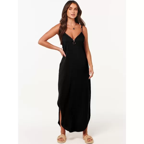 ANRABESS Women's Summer Casual Loose Sleeveless Straps V Neck Zipper Front Flowy Slit Maxi Beach Sun Dress(Black)