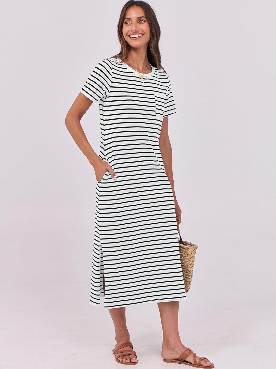 imageANRABESS Womens Summer Casual Midi Dress Short Sleeve Crewneck T Shirt Long Dresses Split Stripe Beach Vacation Travel OutfitWhite Black Stripe