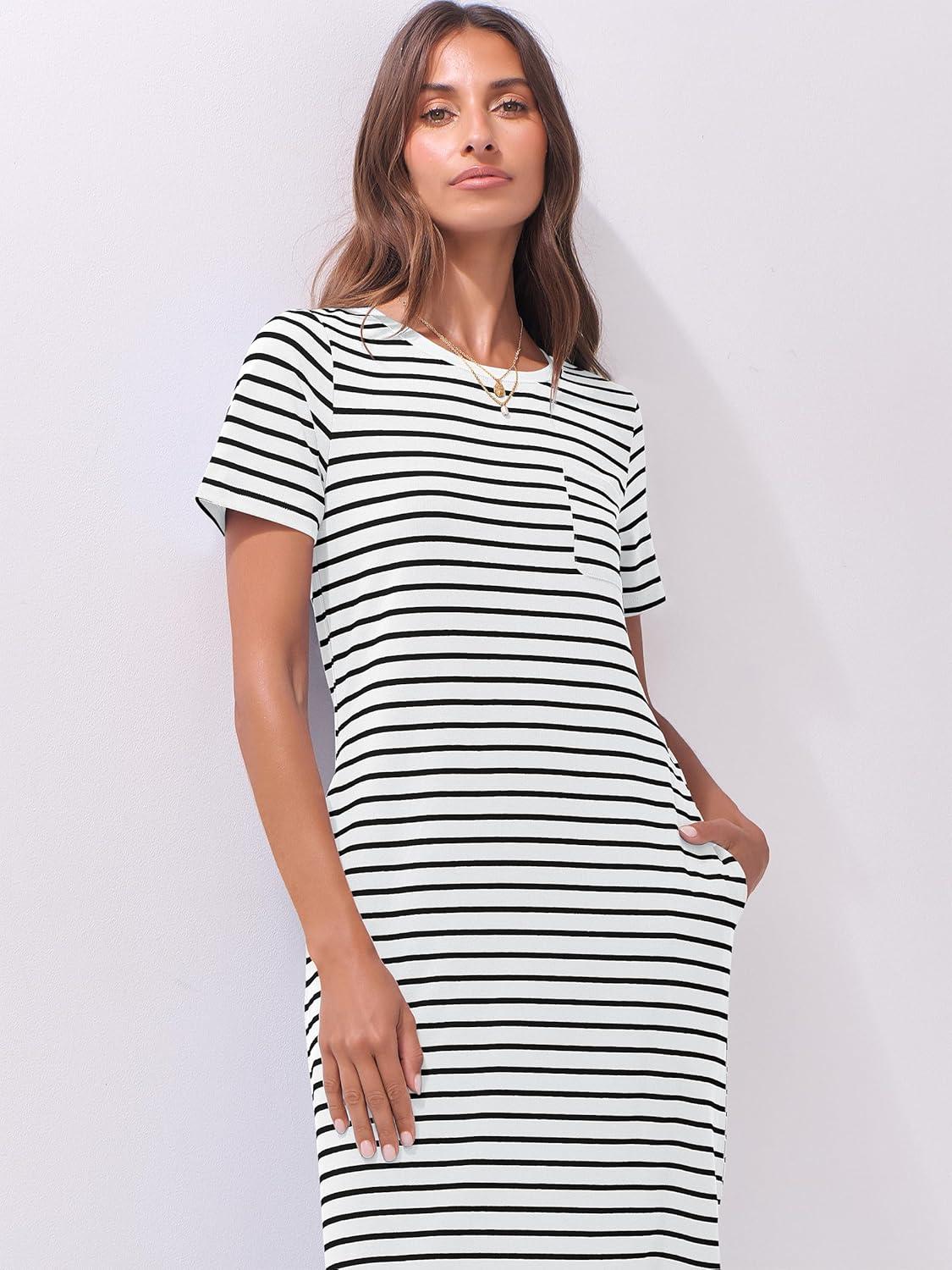 ANRABESS Womens Summer Casual Midi Dress Short Sleeve Crewneck T Shirt Long Dresses Split Stripe Beach Vacation Travel Outfit(White Black Stripe)