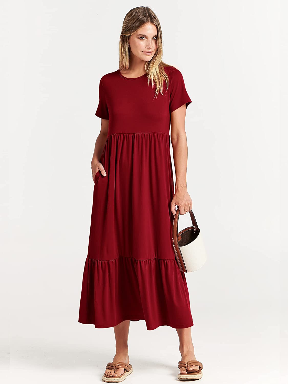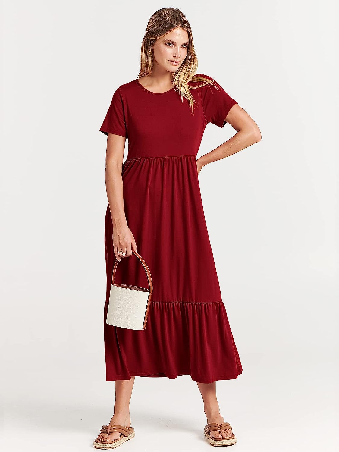 ANRABESS Women’s Summer Casual Short Sleeve Crewneck Swing Dress Casual Flowy Tiered Maxi Beach Dress with Pockets(Wine Red)