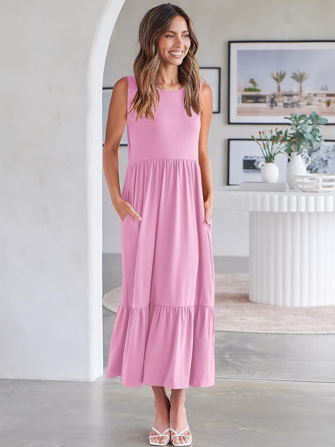 ANRABESS Women’s Summer Casual Sleeveless Crewneck Swing Sundress Fit & Flare Flowy Tiered Maxi Dress with Pockets(Light Pink)