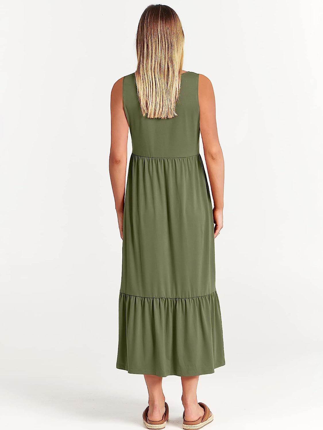 Features – Stretch, casual style, sleeveless,two side pockets, round neck, maxi length,empire waist,elastic at waist,tiered skirt,not lined, beach dress, It is perfect for summer, Spring and fall.
