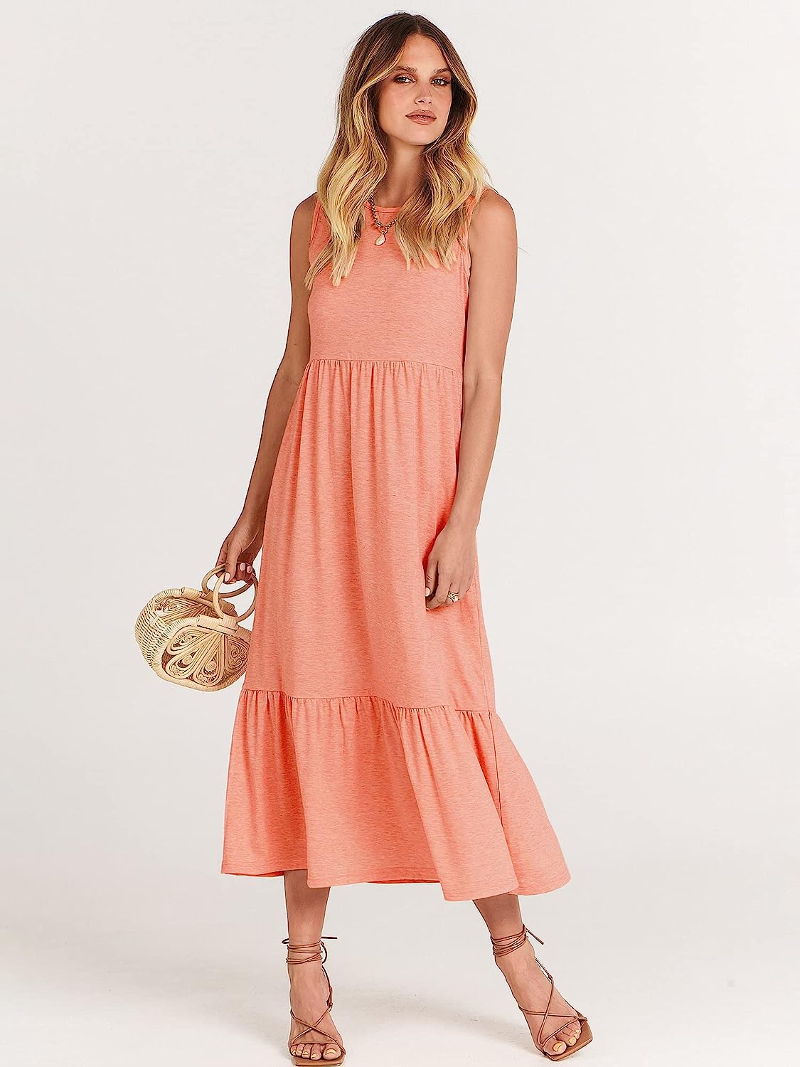 ANRABESS Women’s Summer Casual Sleeveless Crewneck Swing Sundress Fit & Flare Flowy Tiered Maxi Dress with Pockets(Pink)