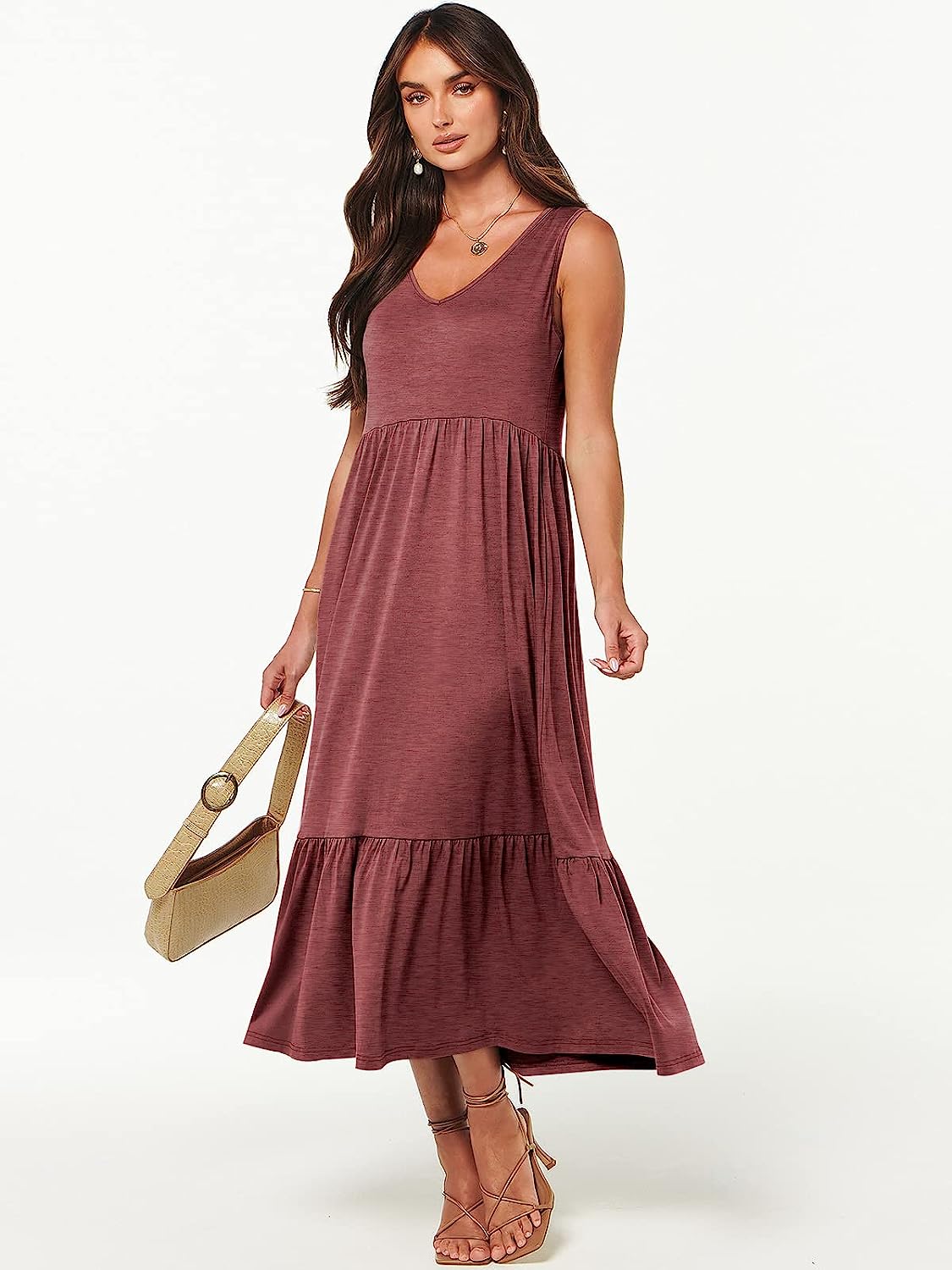 Features – Sleeveless, v neck, maxi dress, two side pockets, casual style, tiered flowy skirt,basic cute beach dress with pockets.