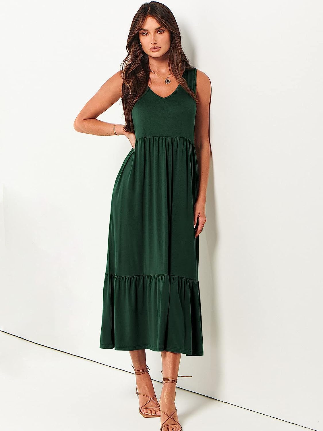 ANRABESS Women’s Summer Casual Sleeveless V Neck Swing Dress Casual Flowy Tiered Maxi Beach Dress with Pockets(10-deep Green)