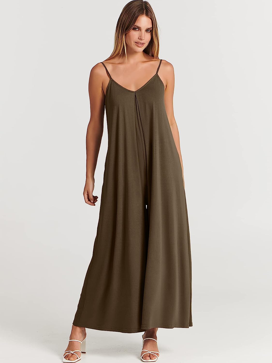 ANRABESS Women’s Summer Casual Spaghetti Strap V Neck Oversized Wide Leg Jumpsuit Pockets Beach Travel Outfits(Coffee)