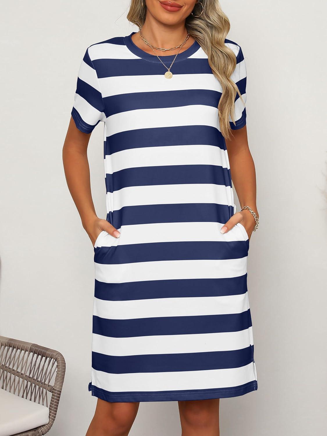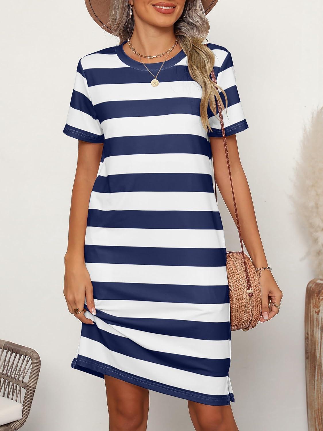 ANRABESS Women's Summer Casual T Shirt Dresses Short Sleeve Crewneck Striped Mini Shift Dress 2025 Beach Vacation Outfits(Navy Blue Stripe)