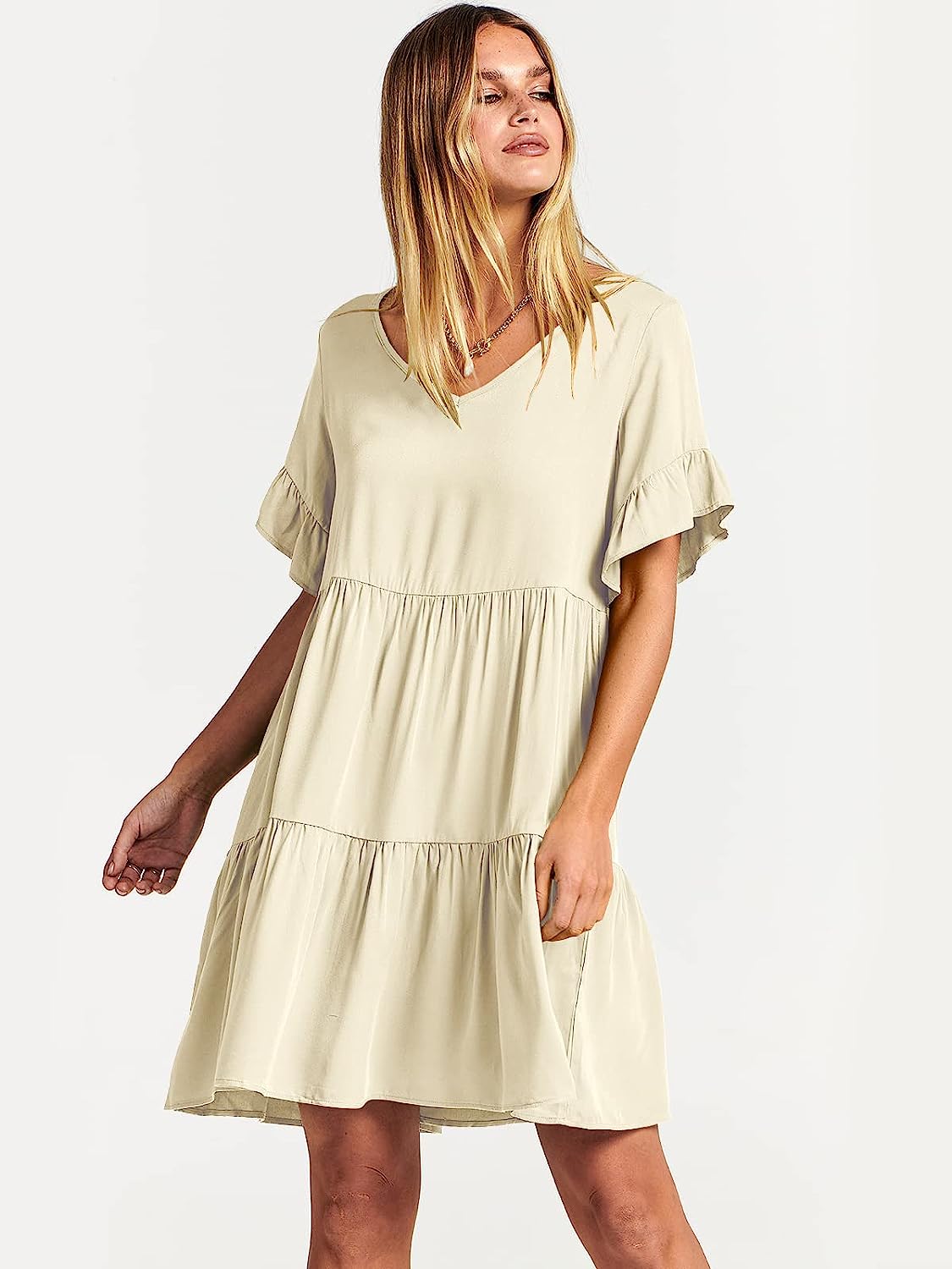 ANRABESS Women’s Summer Casual V Neck Babydoll Dress Ruffle Short Sleeve Tiered A-Line Flowy Mini Beach Dress(Beige)