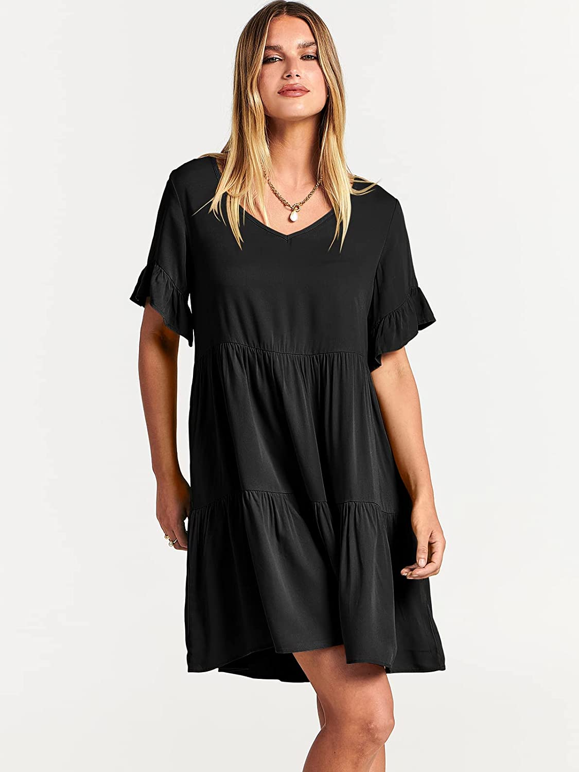 imageANRABESS Womens Summer Casual V Neck Babydoll Dress Ruffle Short Sleeve Tiered ALine Flowy Mini Beach DressBlack
