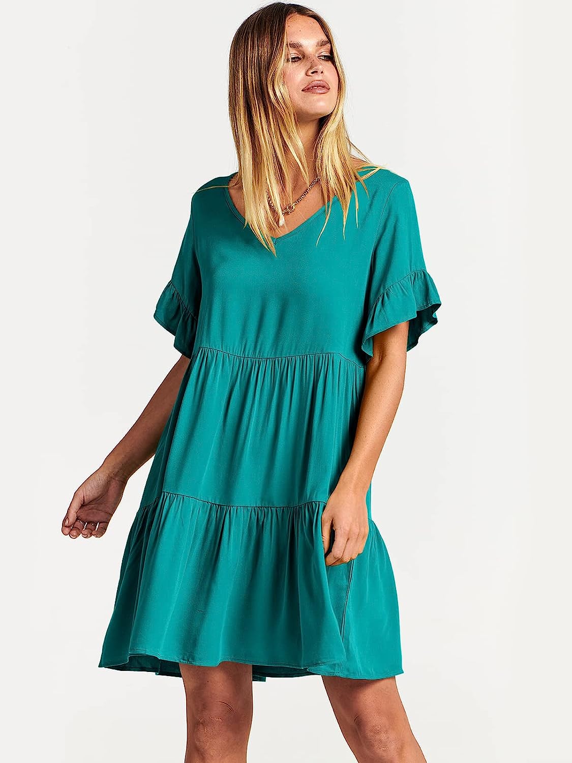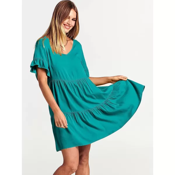 ANRABESS Women’s Summer Casual V Neck Babydoll Dress Ruffle Short Sleeve Tiered A-Line Flowy Mini Beach Dress(Lake Blue)