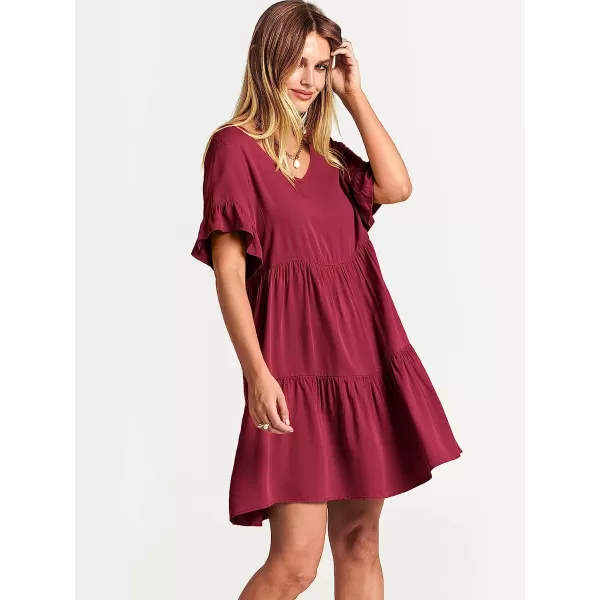 ANRABESS Women’s Summer Casual V Neck Babydoll Dress Ruffle Short Sleeve Tiered A-Line Flowy Mini Beach Dress(Wine Red)