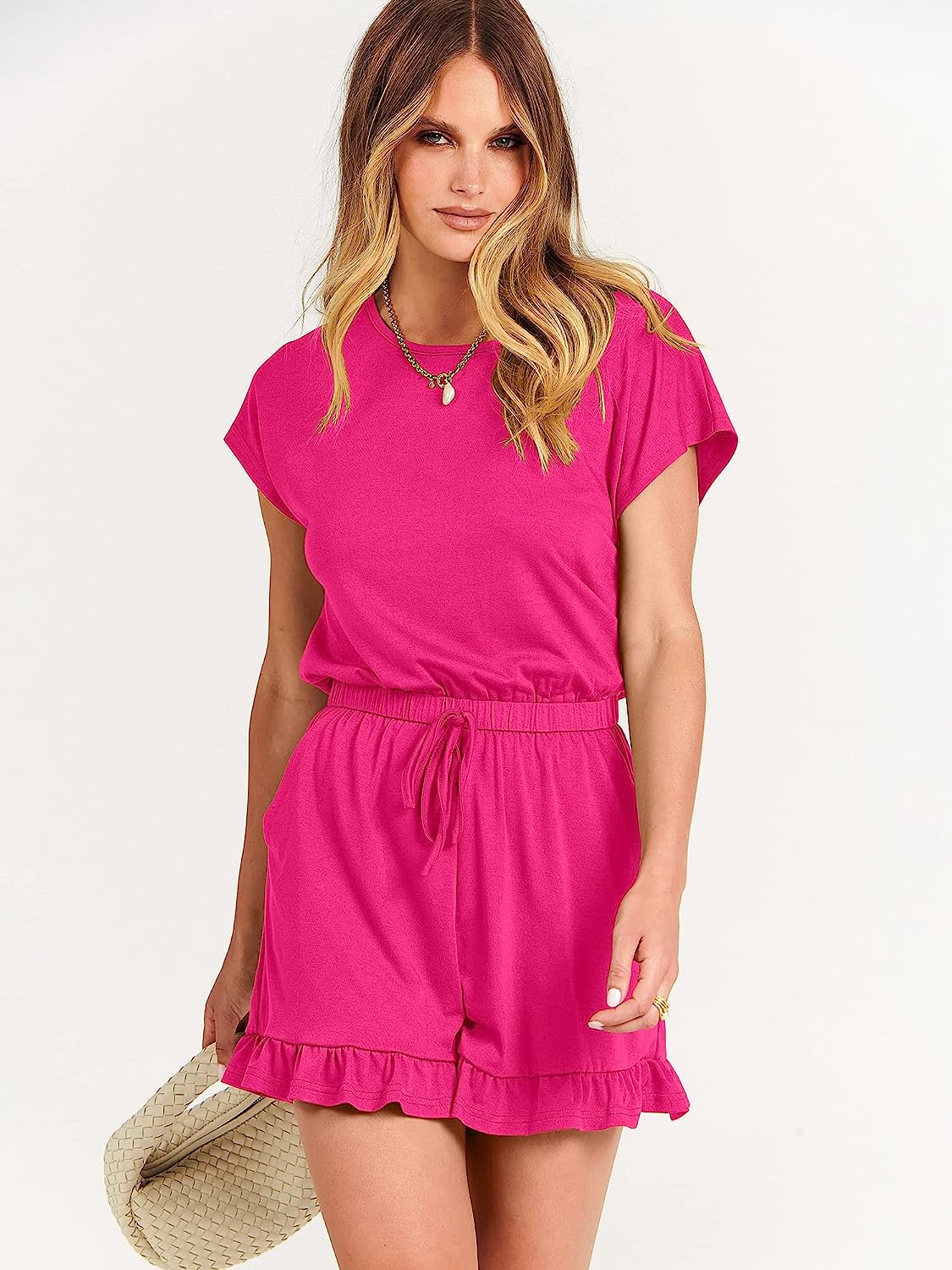 ANRABESS Women’s Summer Crewneck Casual Loose Short Sleeve One Piece Jumpsuit Rompers Outfits with Pockets(Rose)