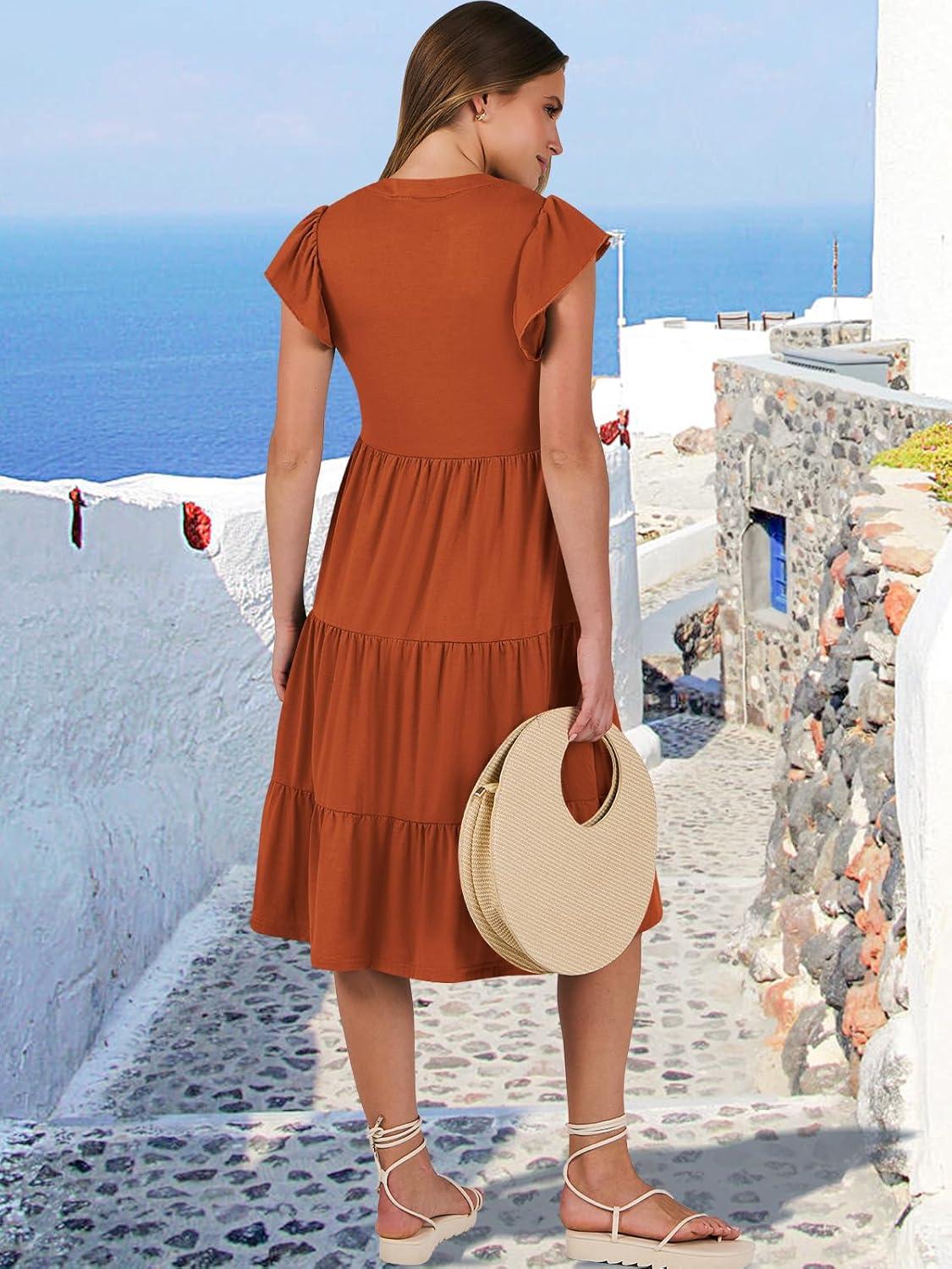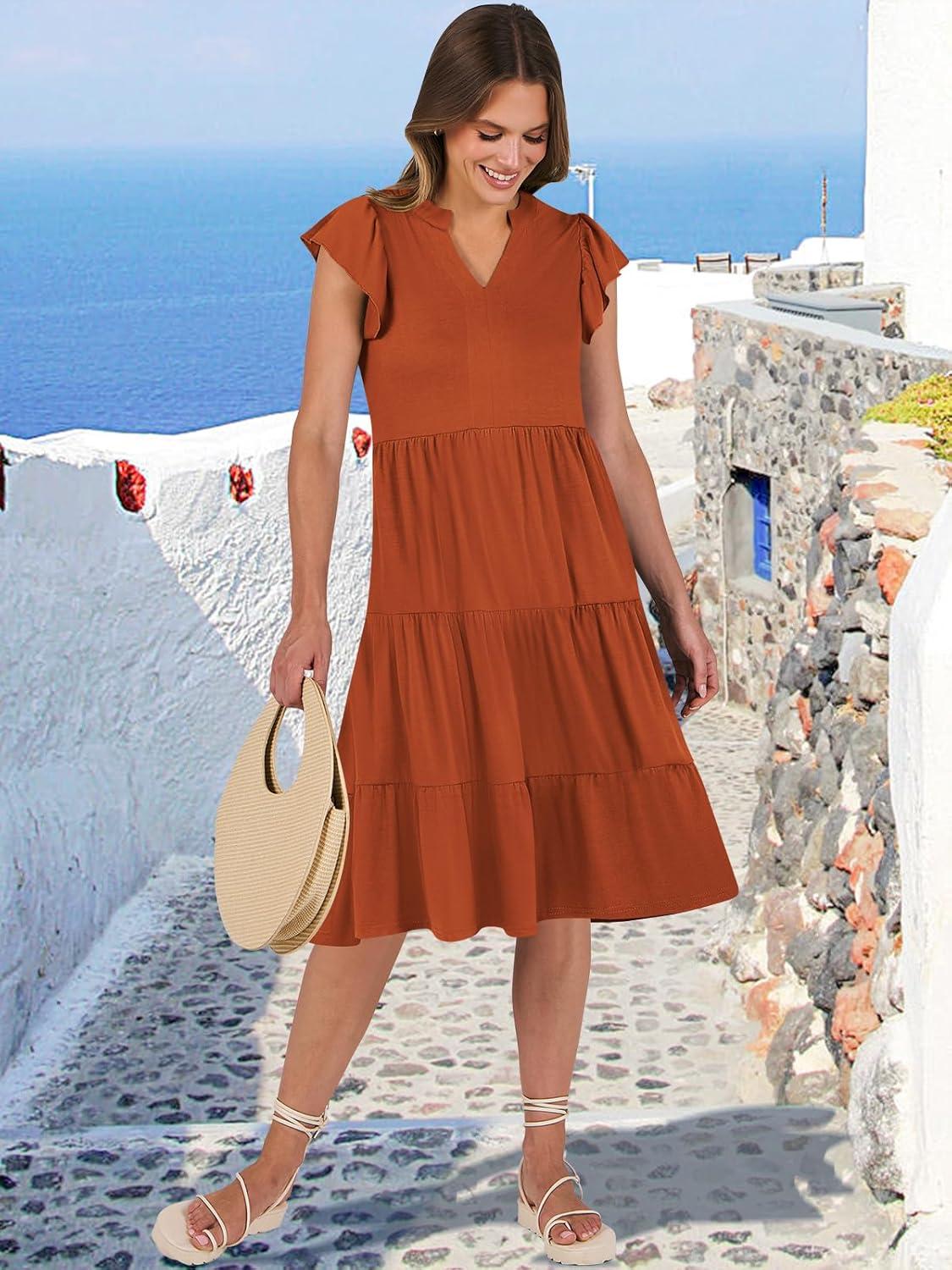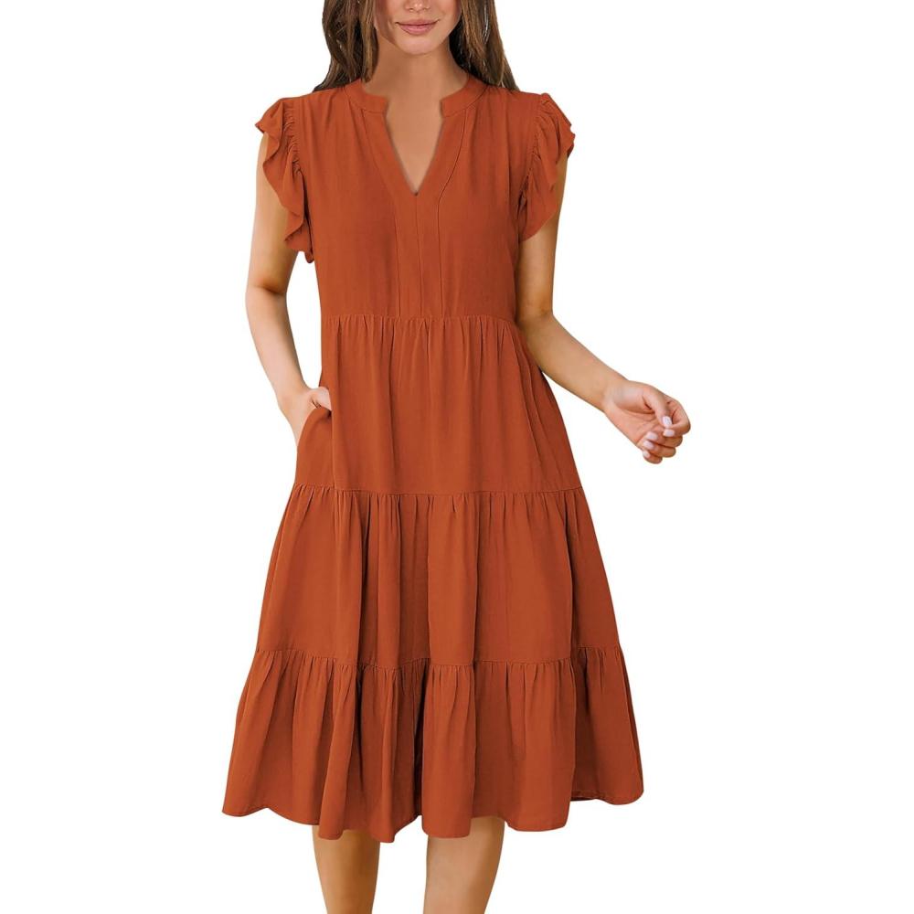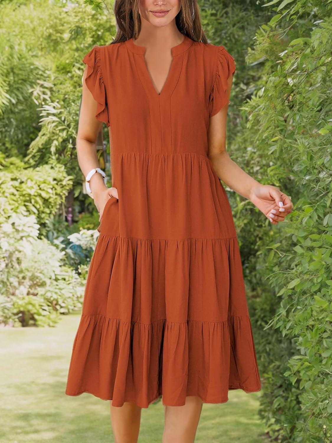 ANRABESS Womens Summer Dress Ruffle Sleeve V Neck Midi Dresses Fashion Casual Fit Flowy Tiered Boho Beach Vacation Sundress(Rust)