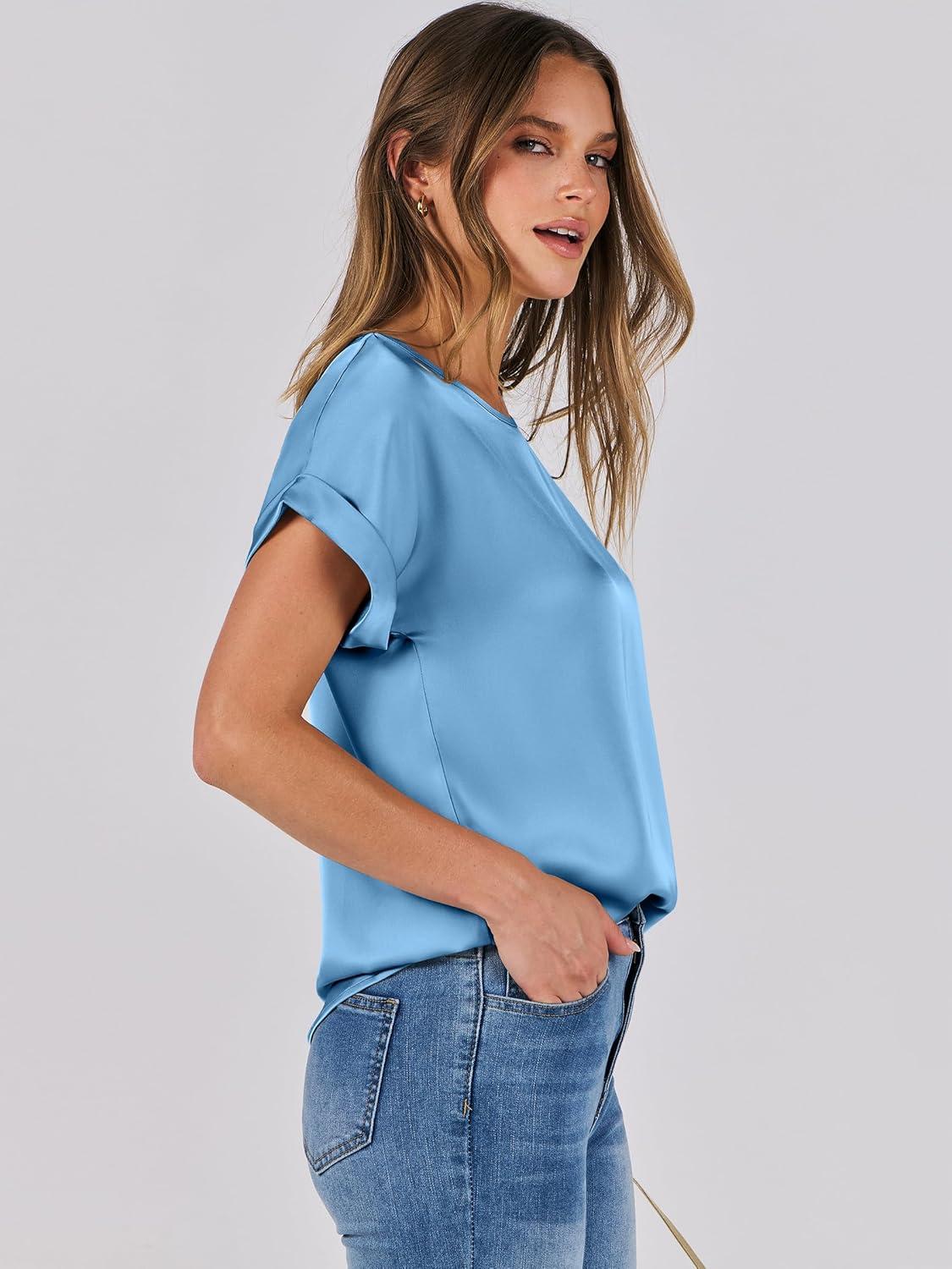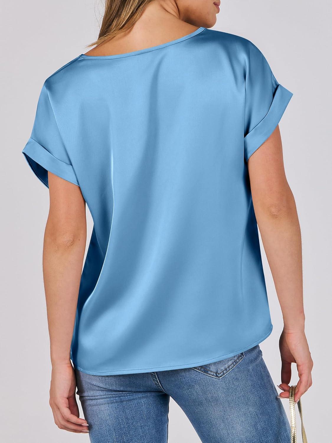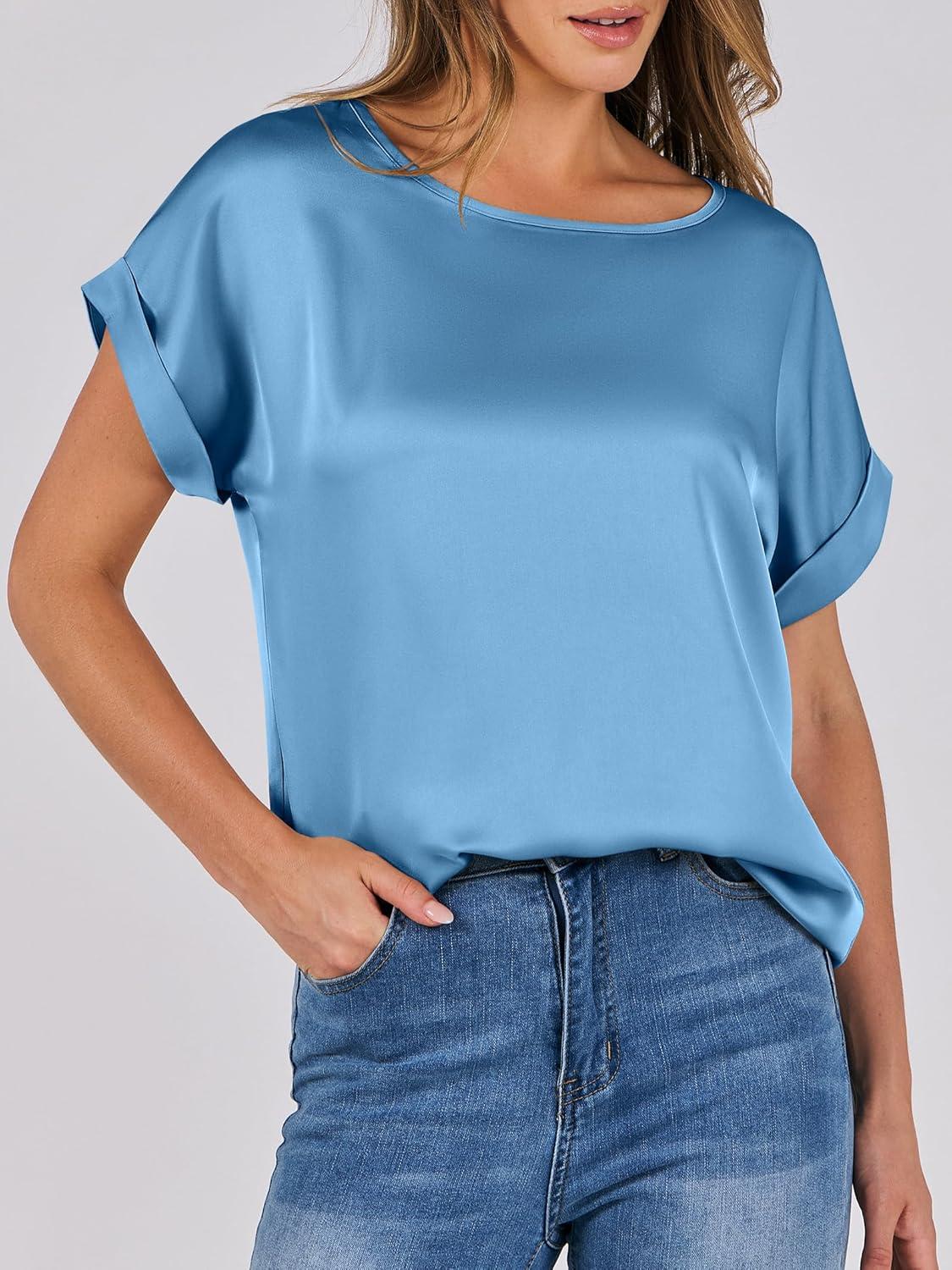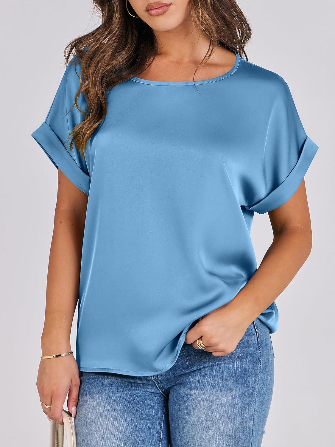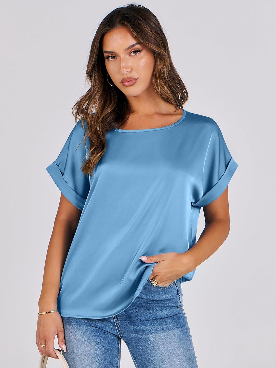 ANRABESS Women’s Summer Dressy Casual Short Sleeve Shirts Crewneck Satin 2025 Business Office Work Blouse Tops(Blue)