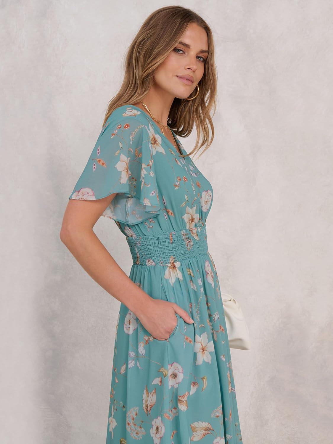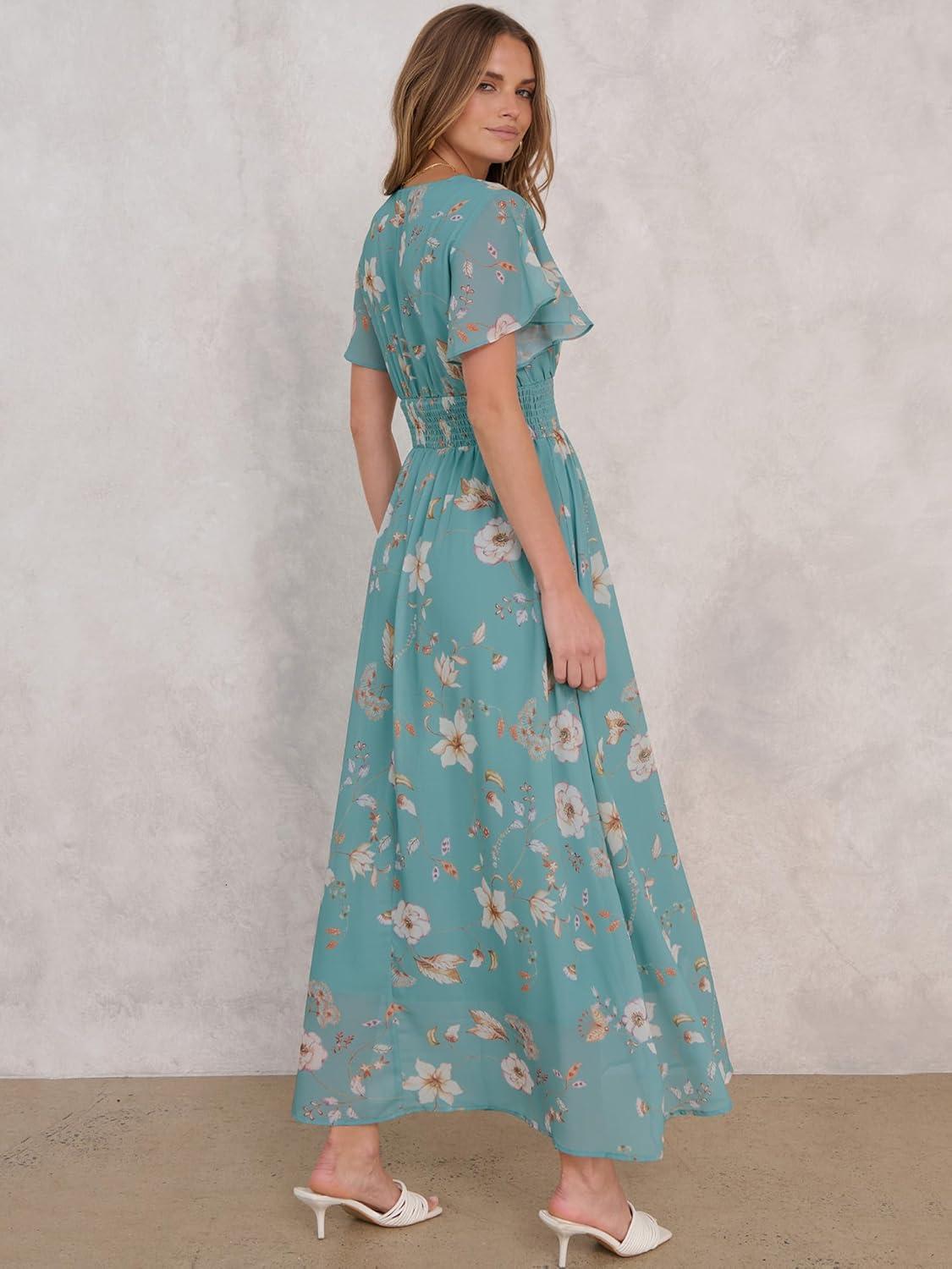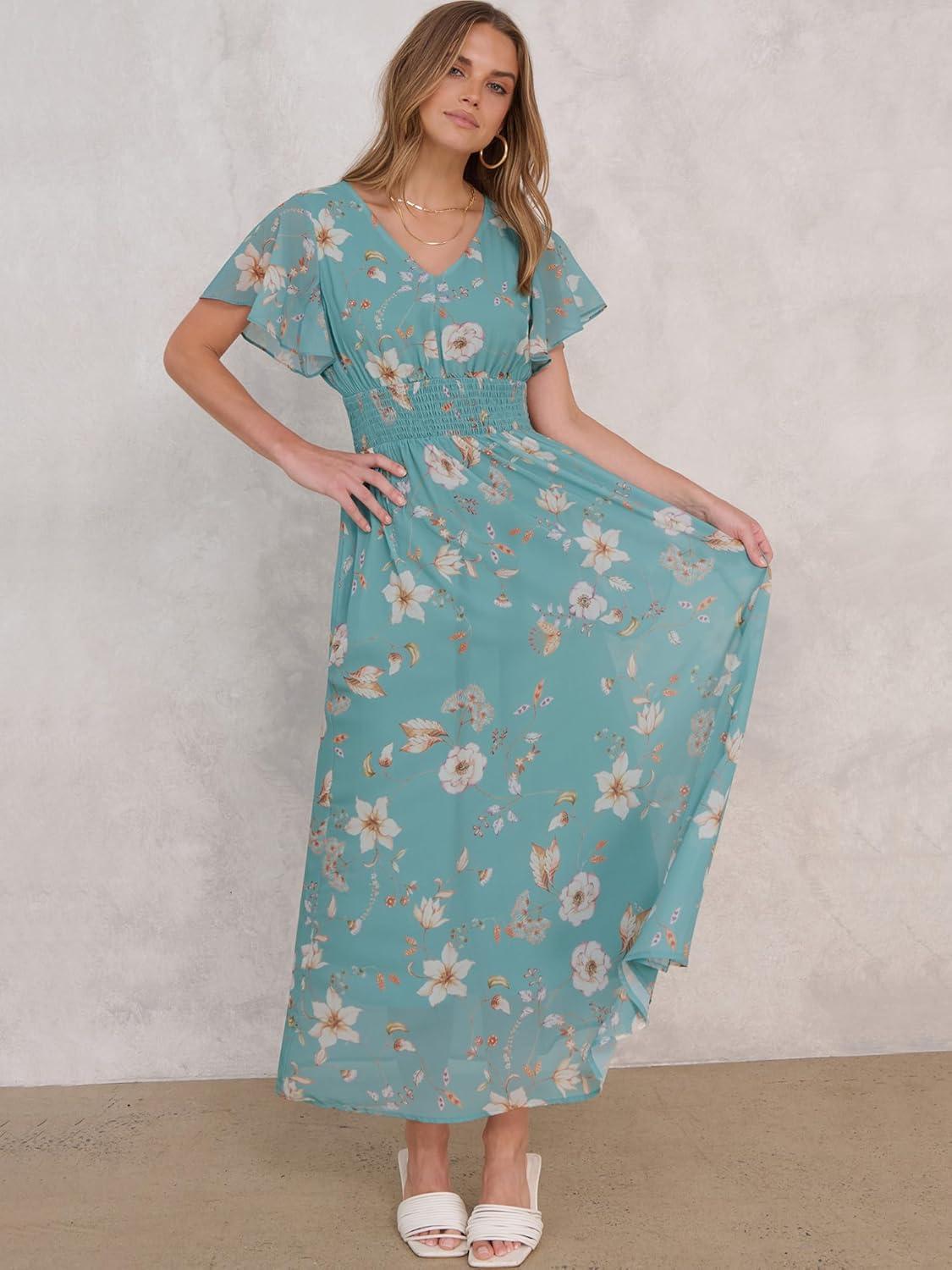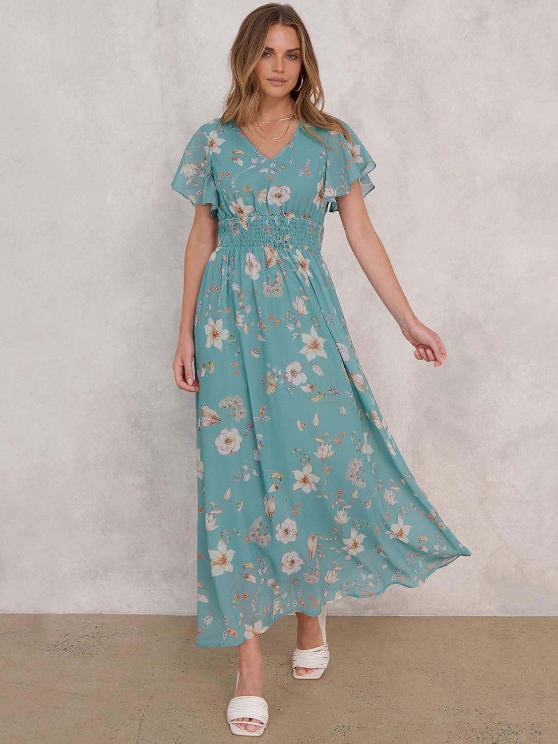 ANRABESS Womens Summer Floral Maxi Dress Casual V Neck Short Sleeve Chiffon Boho Flowy Beach 2025 Wedding Guest Long Dresses(Cadetblue Flor)