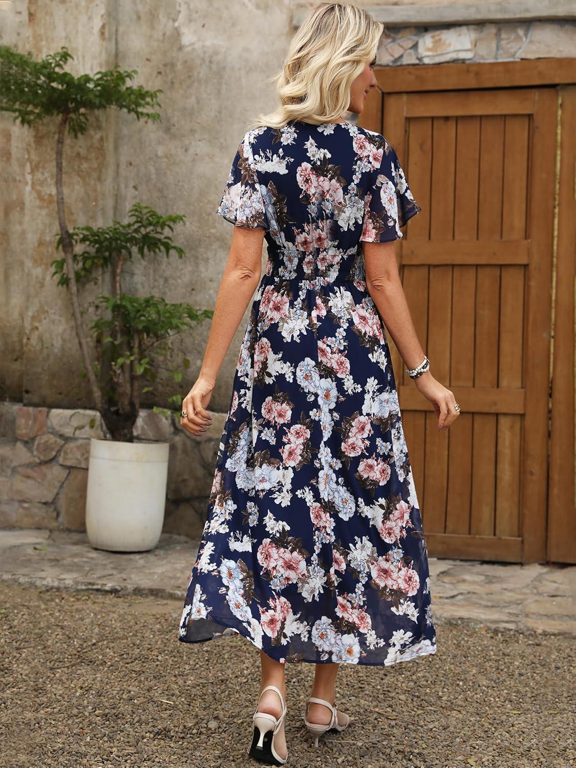 ANRABESS Womens Summer Floral Maxi Dress Casual V Neck Short Sleeve Chiffon Boho Flowy Beach 2025 Wedding Guest Long Dresses(Navy Flor)