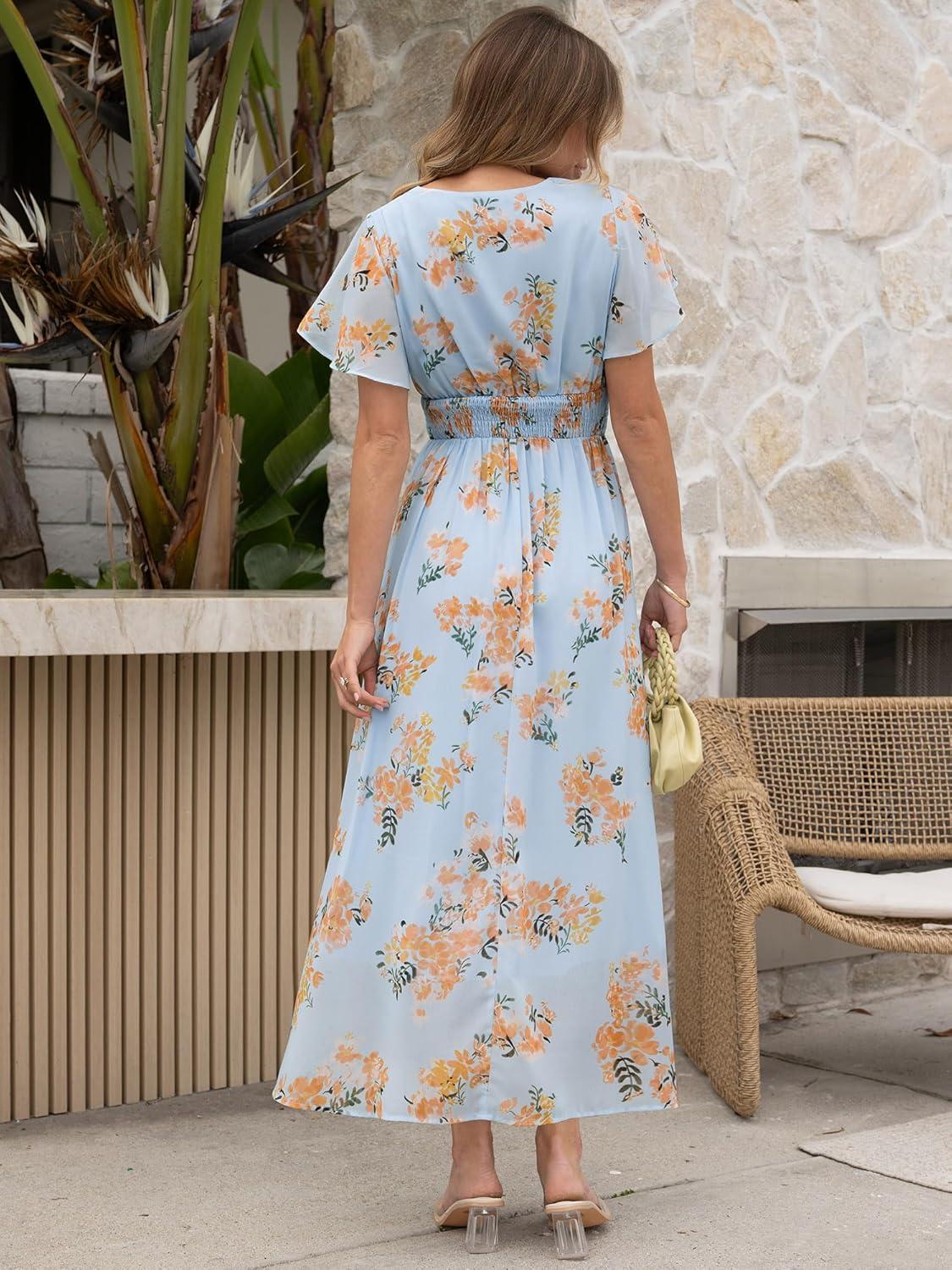 imageANRABESS Womens Summer Floral Maxi Dress Casual V Neck Short Sleeve Chiffon Boho Flowy Beach 2025 Wedding Guest Long DressesOrange Floral Print