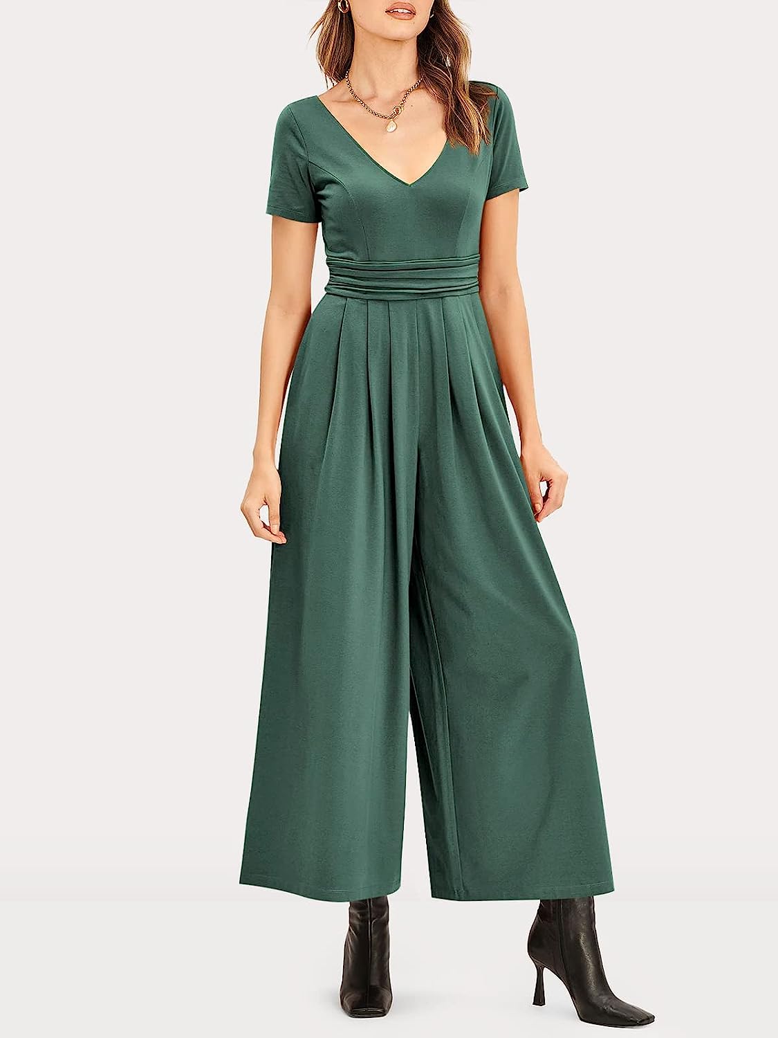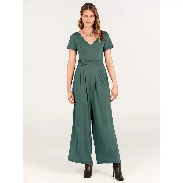 imageANRABESS Womens Summer Jumpsuit Casual Short Sleeve V Neck Pleated High Waist Wide Leg Jumpsuit Romper with Pockets08green