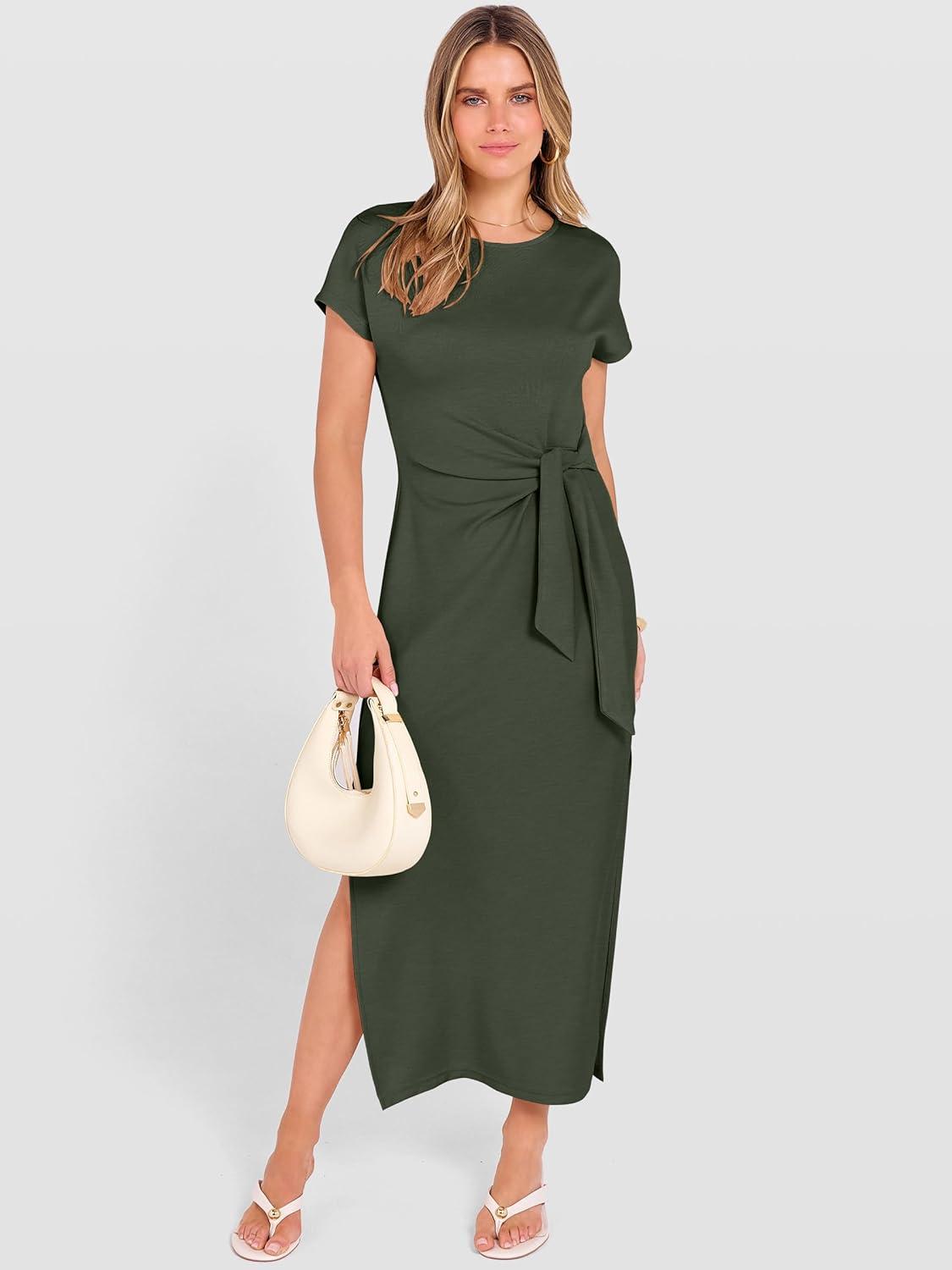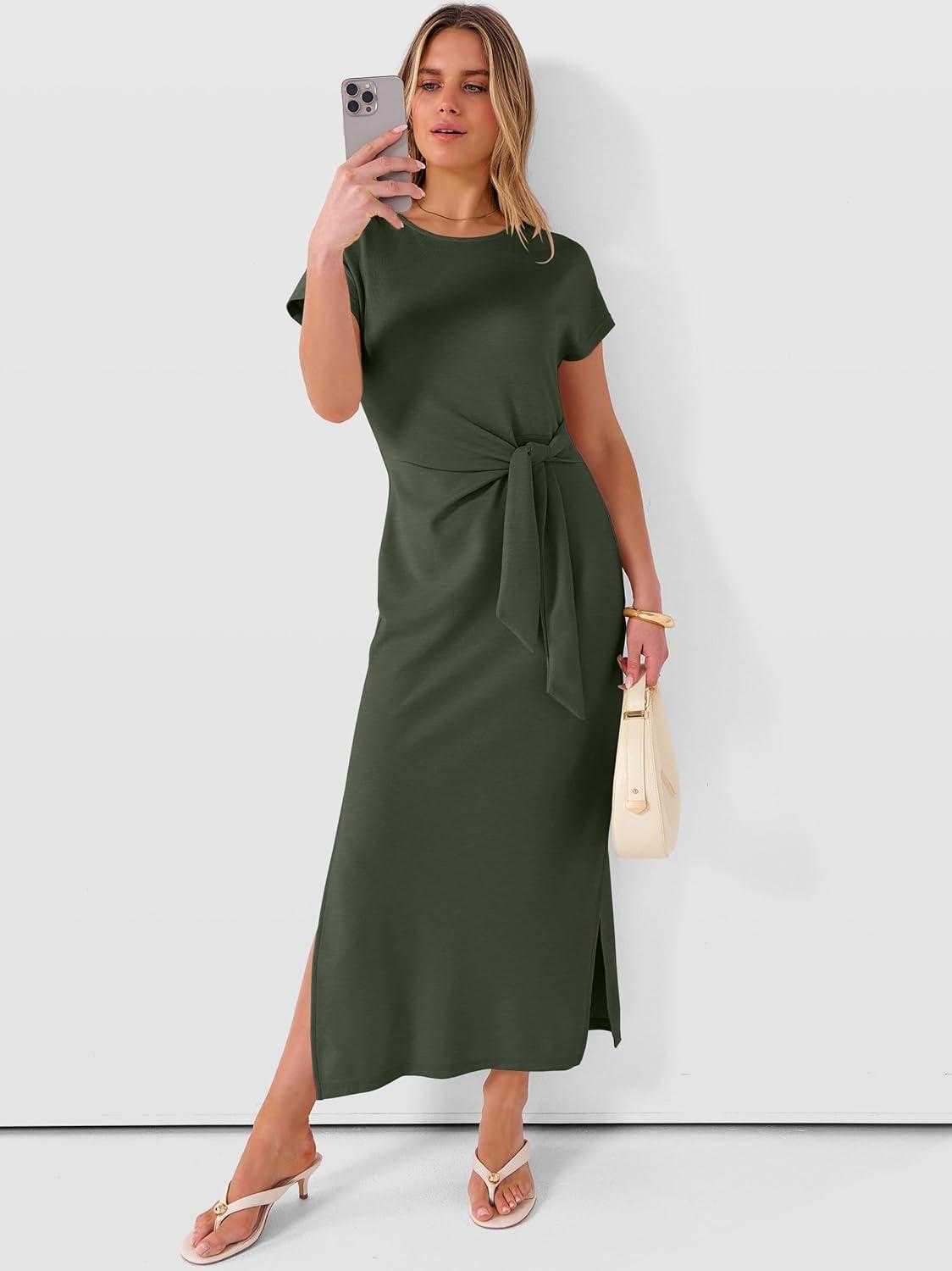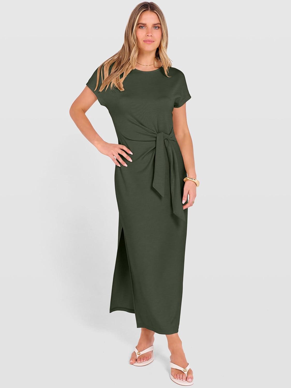 imageANRABESS Womens Summer Maxi Dress Casual Crew Neck Tie Waist Split WrinkleFree Fit Long Fashion Vacation Dresses 2026 SpringArmy Green