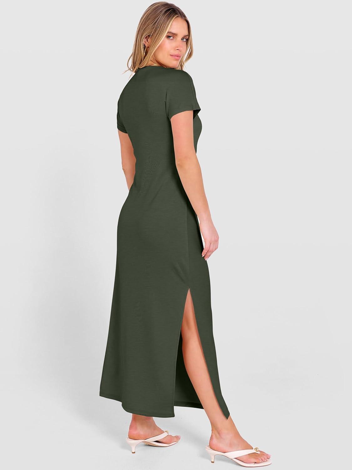 ANRABESS Womens Summer Maxi Dress Casual Crew Neck Tie Waist Split Wrinkle-Free Fit Long Fashion Vacation Dresses 2026 Spring(Army Green)