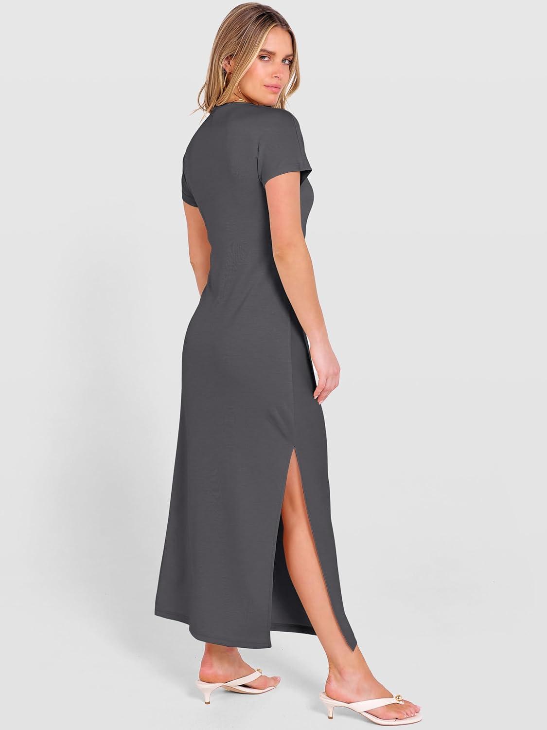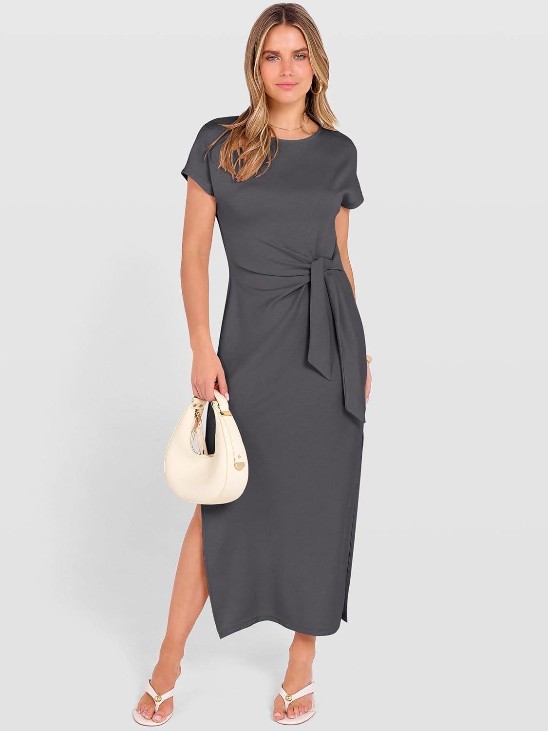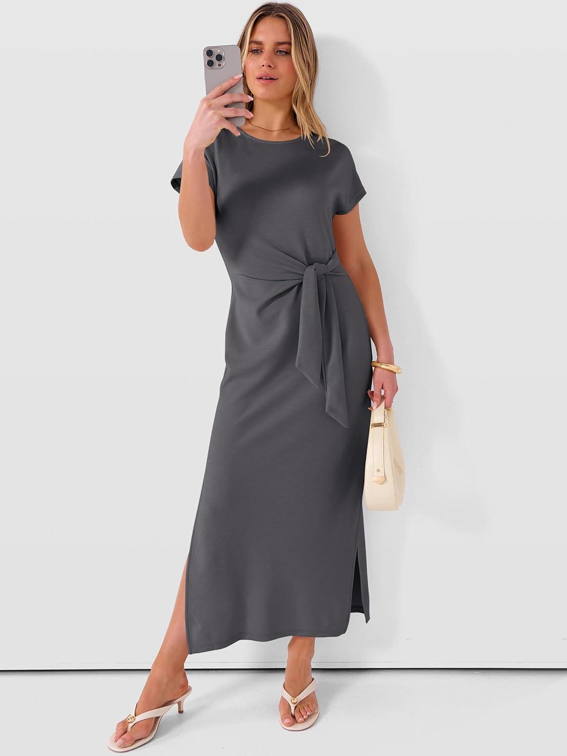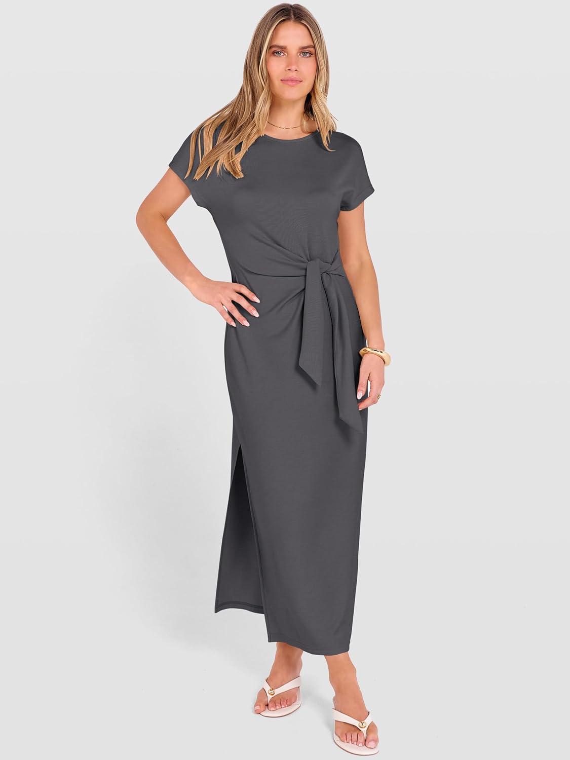 ANRABESS Womens Summer Maxi Dress Casual Crew Neck Tie Waist Split Wrinkle-Free Fit Long Fashion Vacation Dresses 2026 Spring(Deep Grey)
