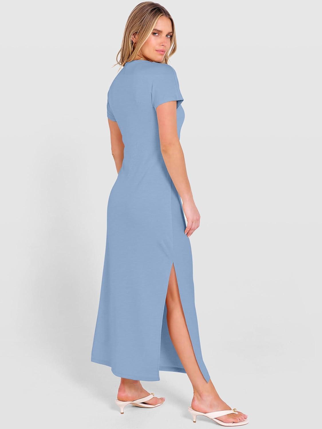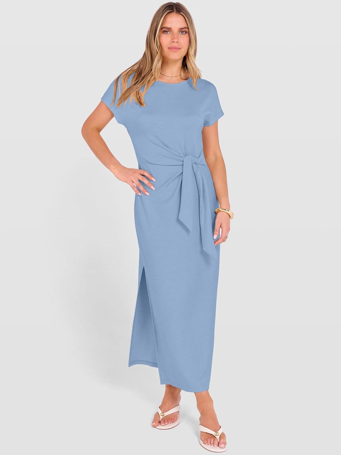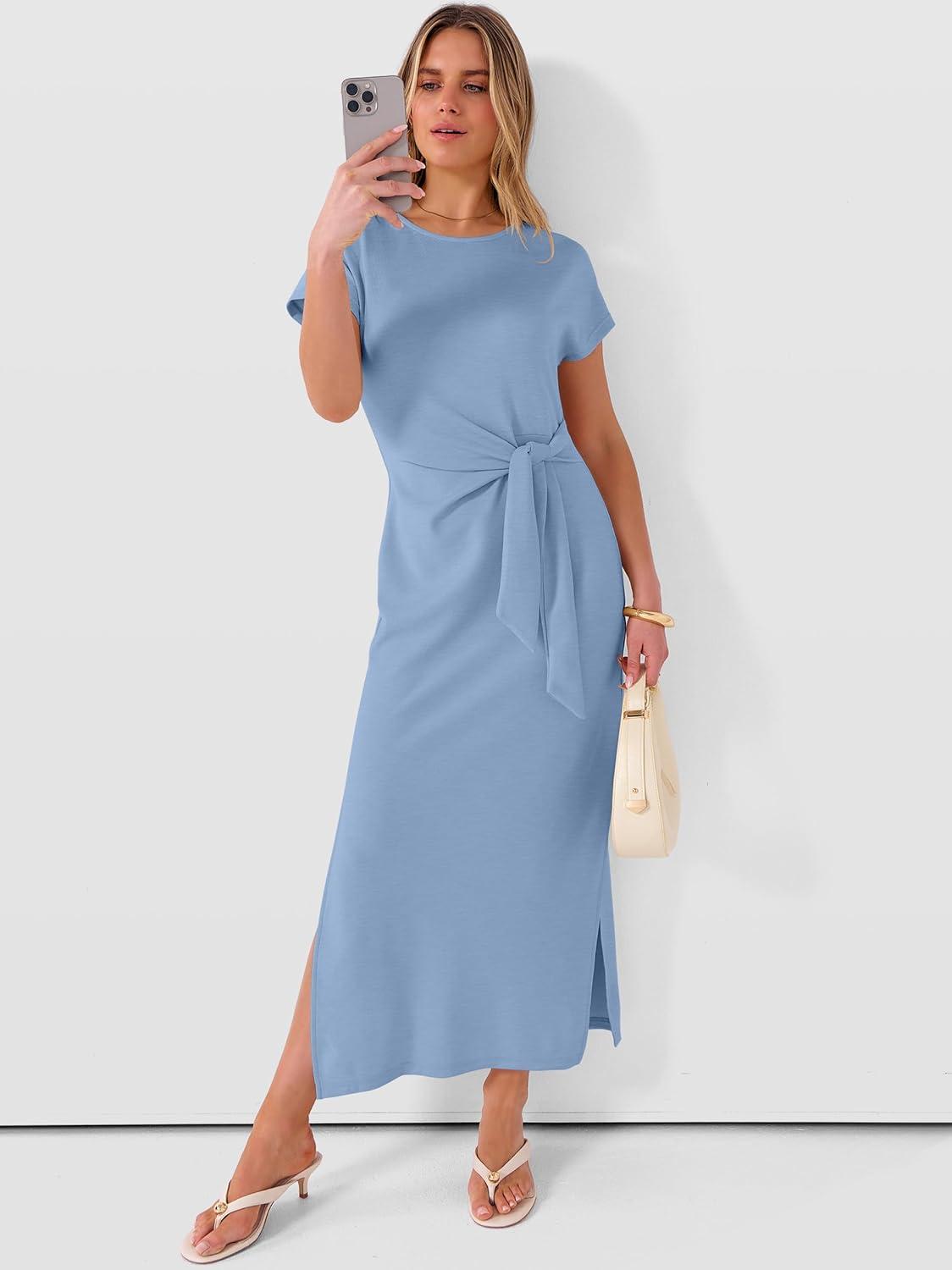 ANRABESS Womens Summer Maxi Dress Casual Crew Neck Tie Waist Split Wrinkle-Free Fit Long Fashion Vacation Dresses 2026 Spring(Light Blue)