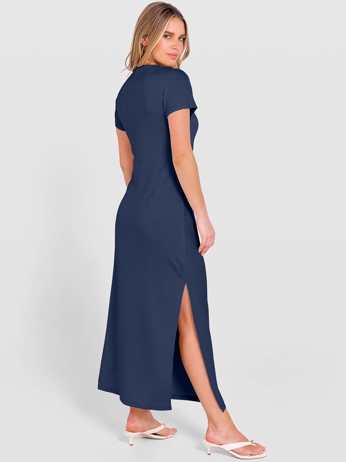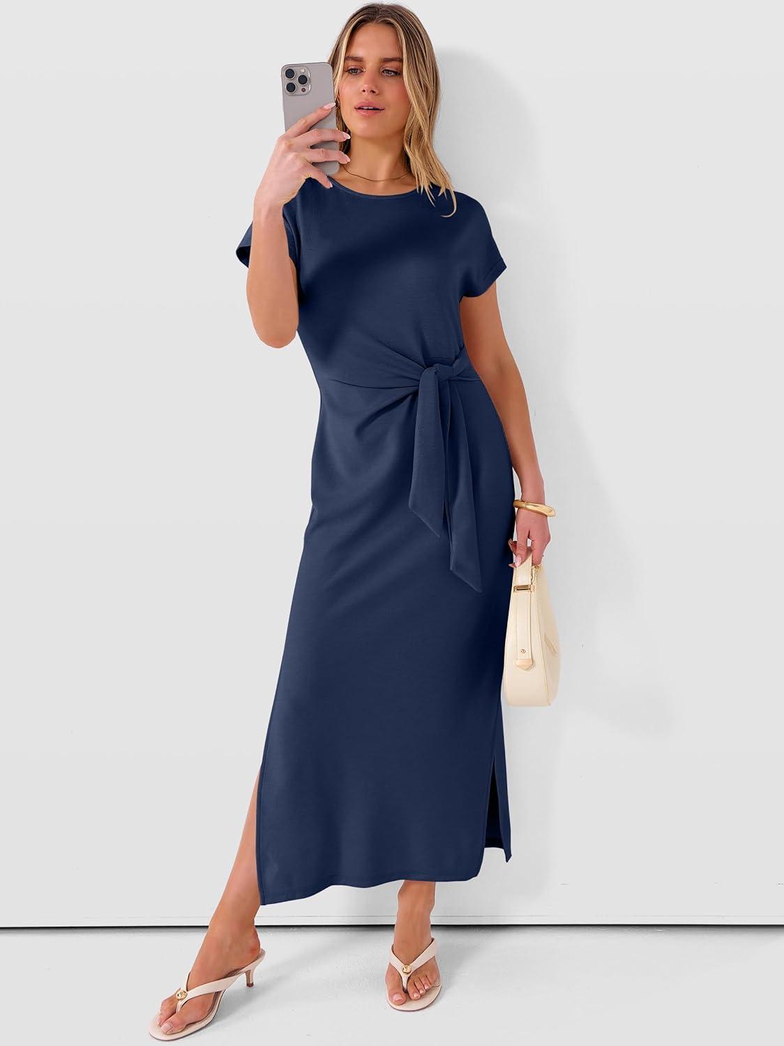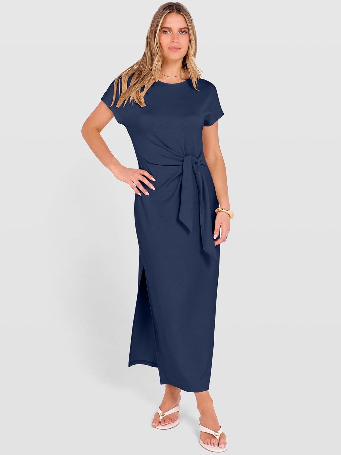 ANRABESS Womens Summer Maxi Dress Casual Crew Neck Tie Waist Split Wrinkle-Free Fit Long Fashion Vacation Dresses 2026 Spring(Navy Blue)
