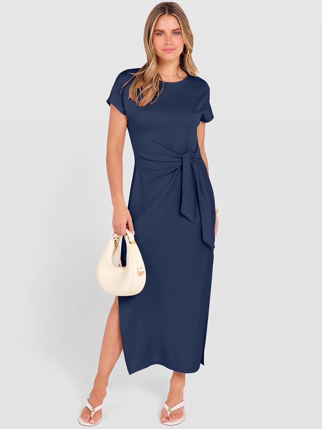 imageANRABESS Womens Summer Maxi Dress Casual Crew Neck Tie Waist Split WrinkleFree Fit Long Fashion Vacation Dresses 2026 SpringNavy Blue